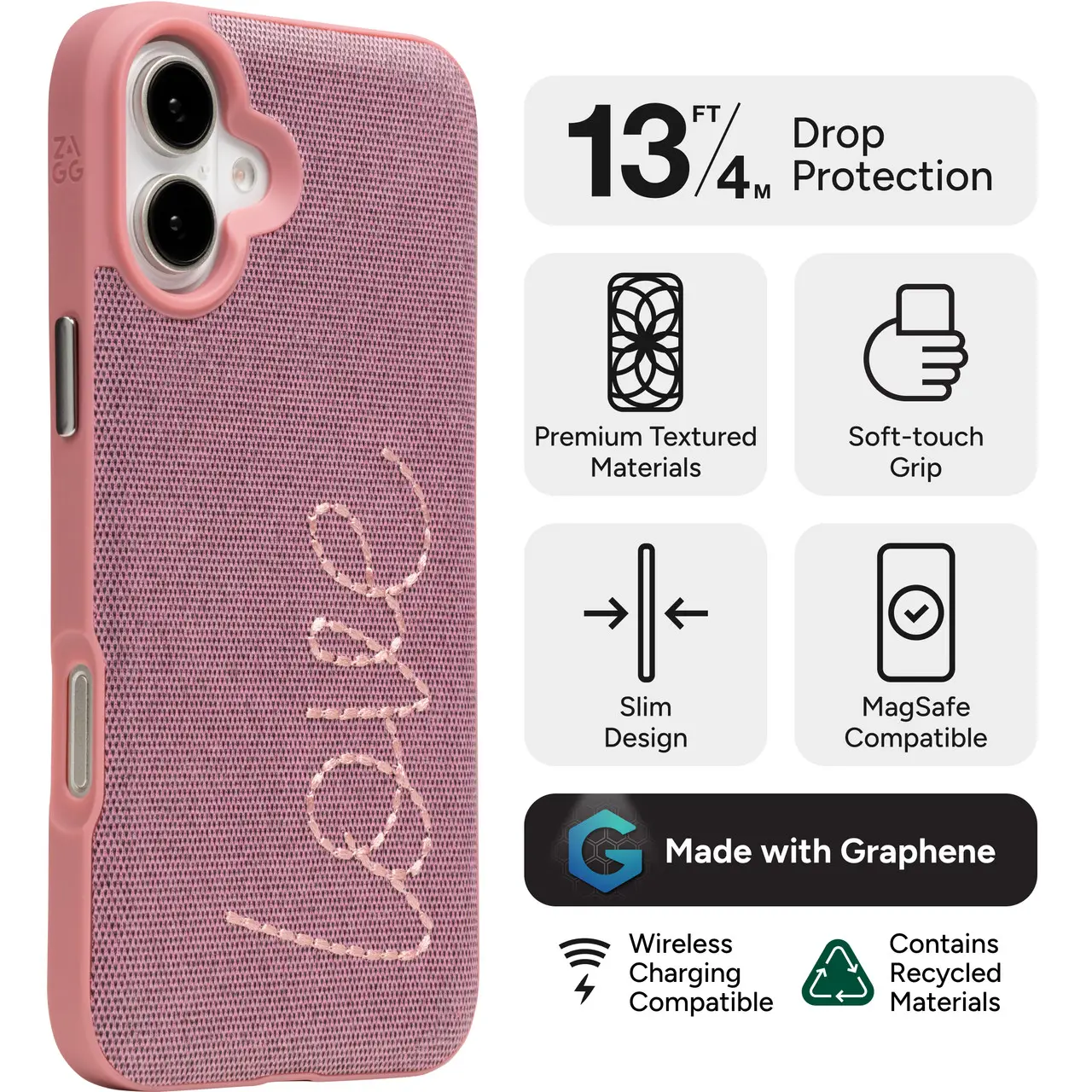 Looking to add a touch of elegance to your iPhone 16 Plus? The ZAGG London Snap Case in pink with a charming "Love" embroidered design is your perfect match. This case combines style and protection, featuring a sleek fabric exterior that feels great in your hand and stands out with its beautiful embroidery. It’s designed to fit your iPhone 16 Plus perfectly, providing reliable protection against everyday bumps and scratches without adding bulk. The lightweight, slim design keeps your phone looking sleek and allows easy access to all buttons and ports. Whether you’re out with friends or at work, this case adds a personal, refined touch to your device. Inside the box, you get the ZAGG London Snap Case ready to snap on and elevate your phone’s look instantly. Treat your phone to style and protection—grab this pink embroidered case and show your love every day!
