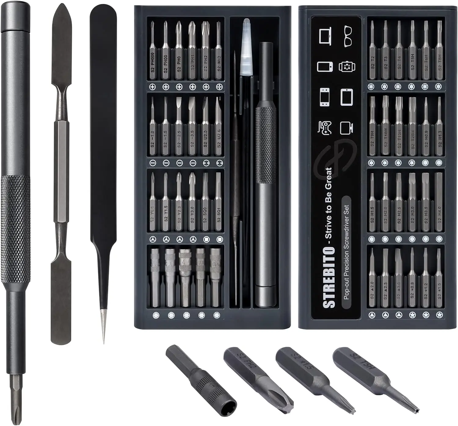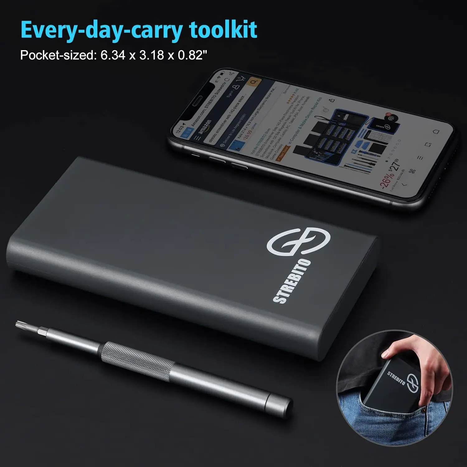 ● 【S2 Steel Bits】Every driver bit of STREBITO precision screwdriver set is made with premium S2 steel and has a hardness of up to 60HRC for long-lasting reliability. The precisely CNC-machined bits fit perfectly into screws and protect both the bit and fasteners from damage. This small screwdriver set will help you get the work done with ease with long tool life