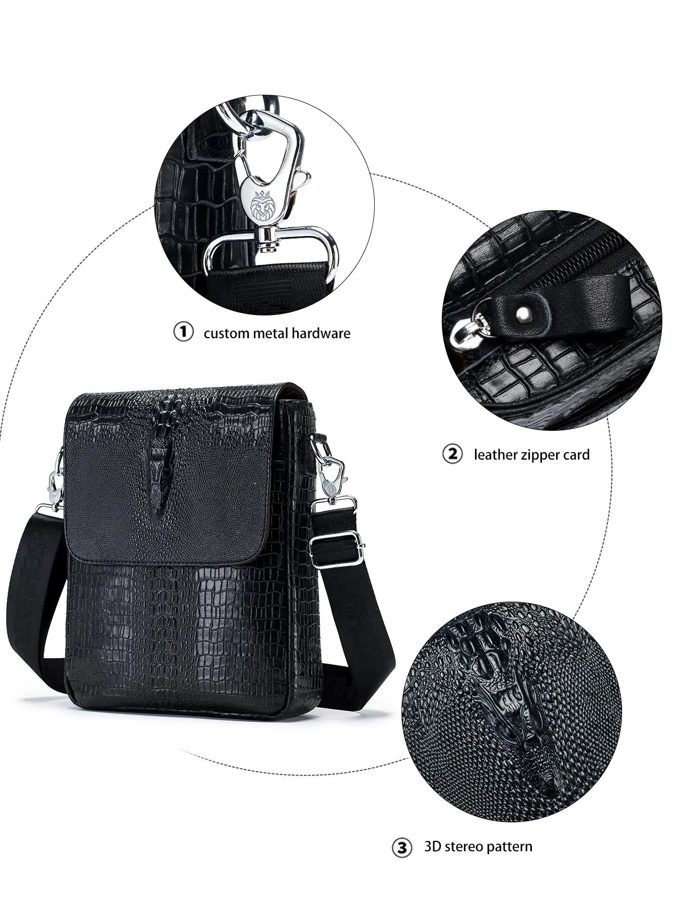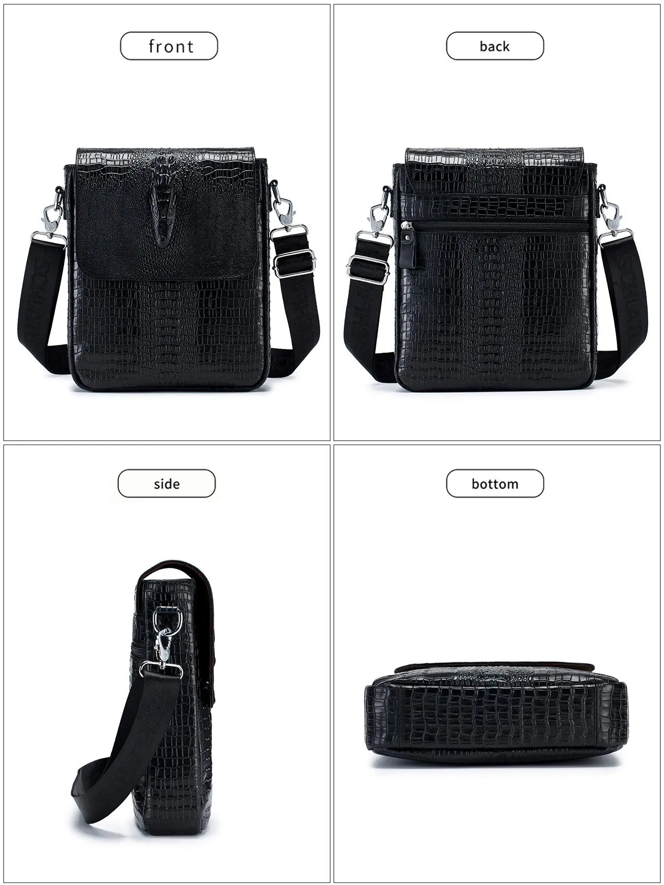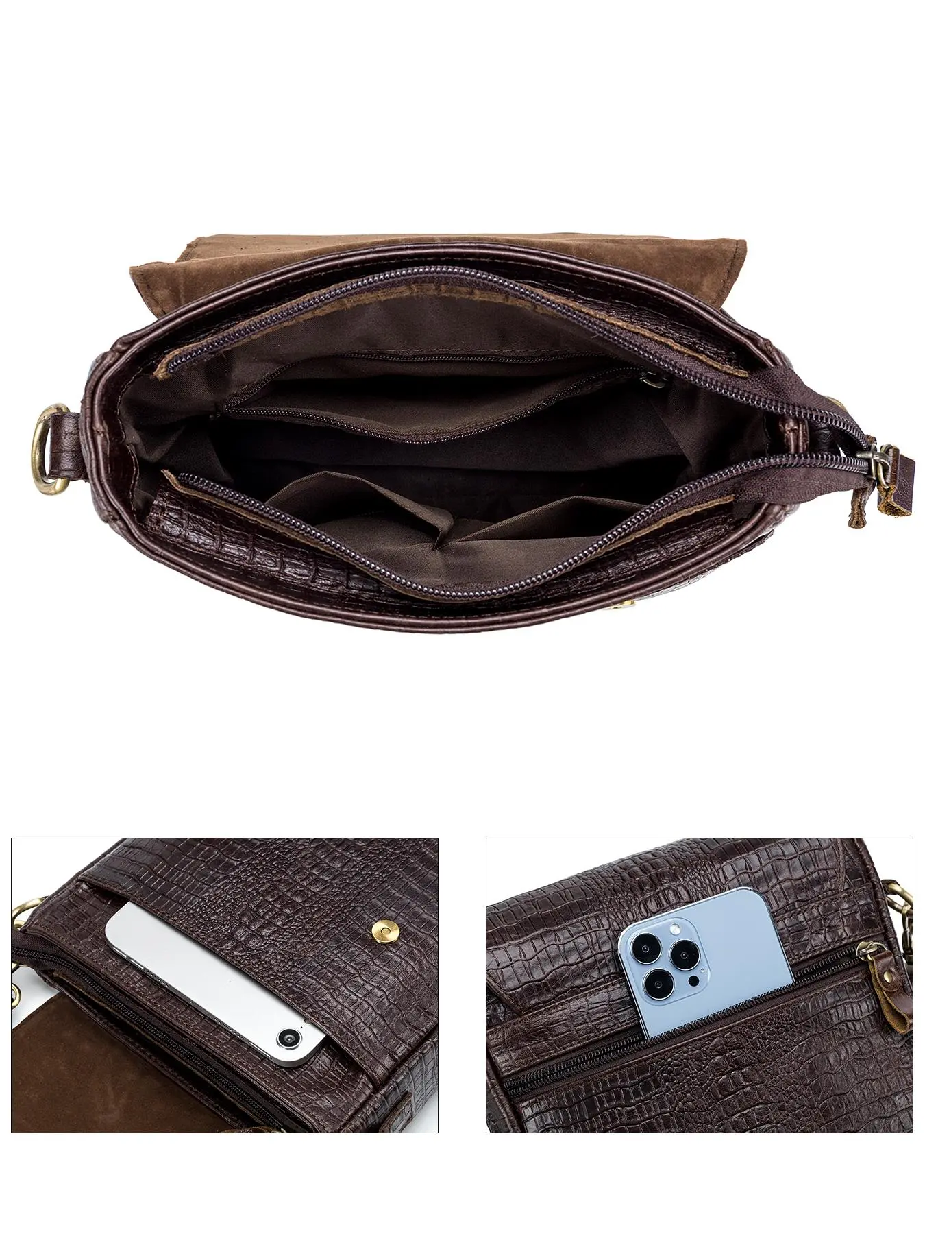 Exactly as show! Very high quality zippers with plenty of space for everything needed, except that the two smaller zippered pouches were about an inch+ too shallow to fully accommodate a passport and zip close. The leather cowhide was very heavy/durable while the alligator embossing was realistic.