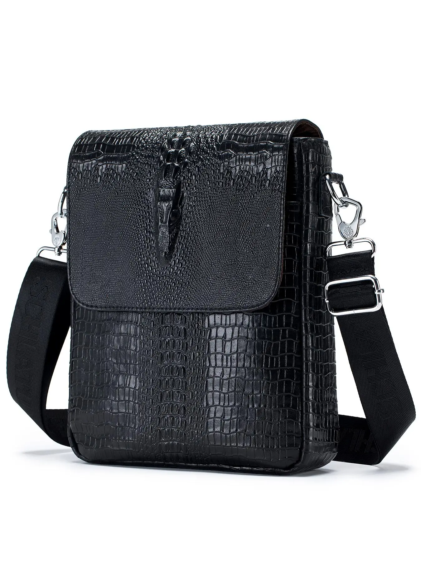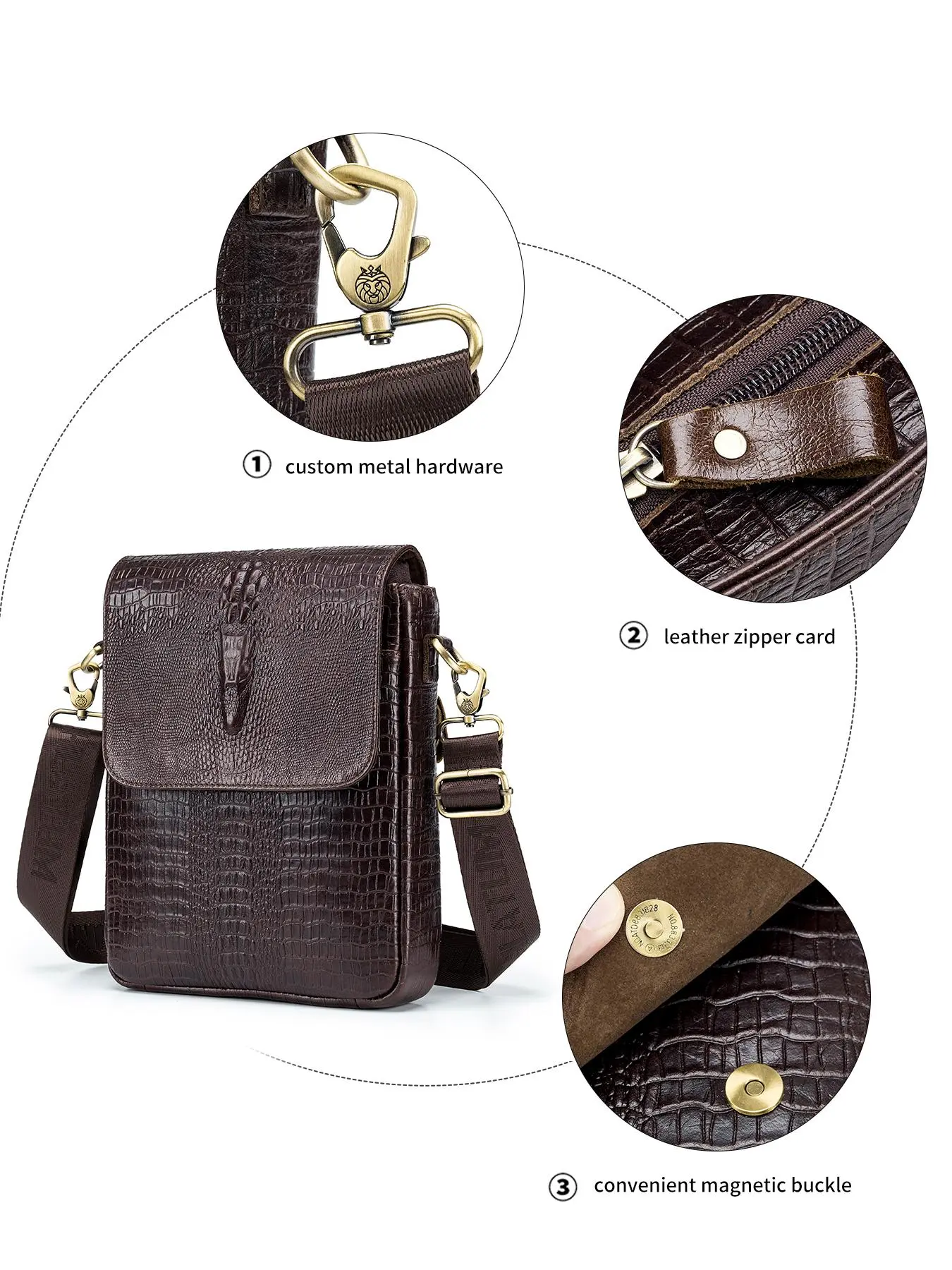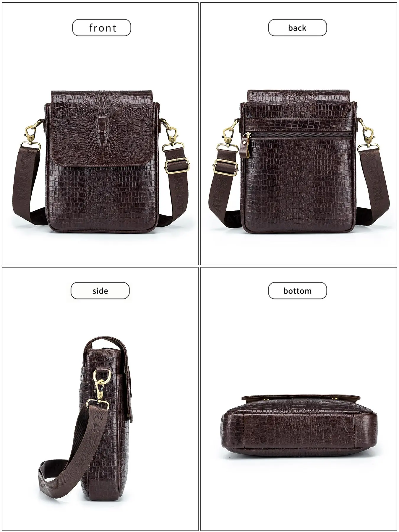 Exactly as show! Very high quality zippers with plenty of space for everything needed, except that the two smaller zippered pouches were about an inch+ too shallow to fully accommodate a passport and zip close. The leather cowhide was very heavy/durable while the alligator embossing was realistic.
