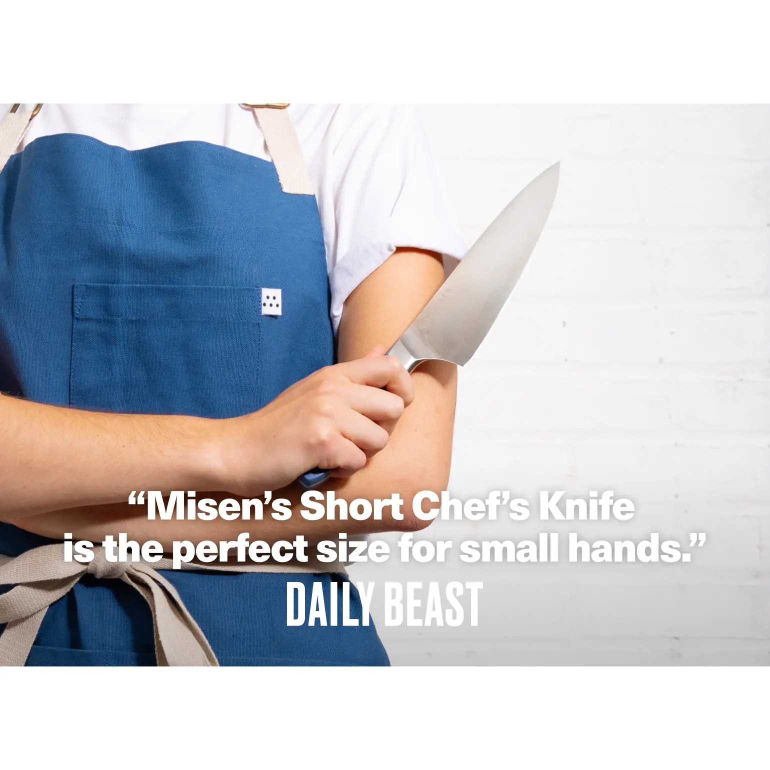 All Misen knives are amazing considering the price. I have the full set but the regular 8" chef knife was a bit longer than my small hands needed. I was excited to see them come out with a short chef knife. I do prefer the blade length and profile of this shorter knife, but the primary drawback is that the balance is not the same as with the 8" chef or the santoku. The short chef knife is more handle-heavy, and where their other knives have their fulcrum right at the start of the sloped bolster (great for a pinchgrip) this one's fulcrum is about a half inch further down the handle. I wish they had taken a bit of weight off the handle to keep the same balance.