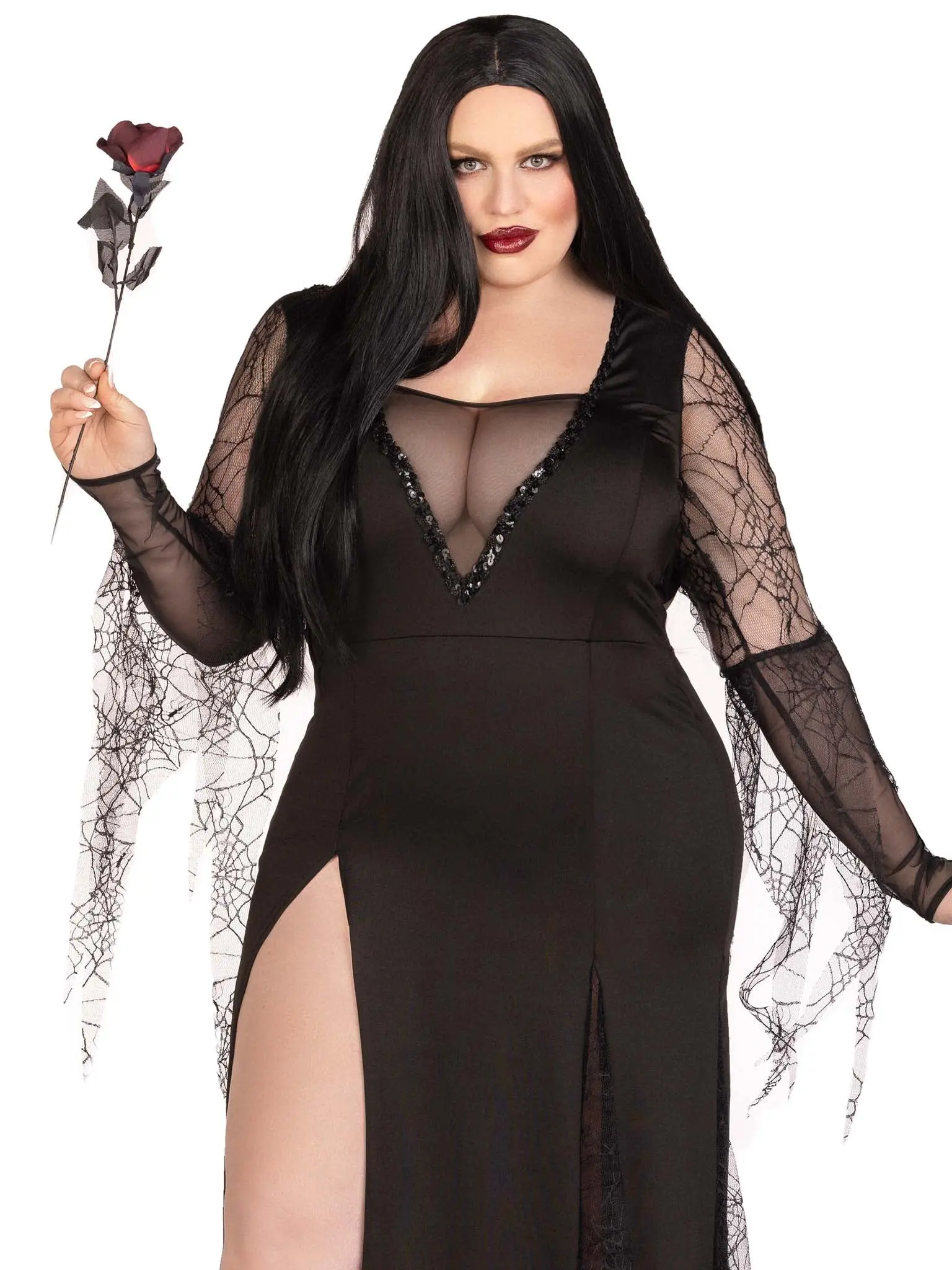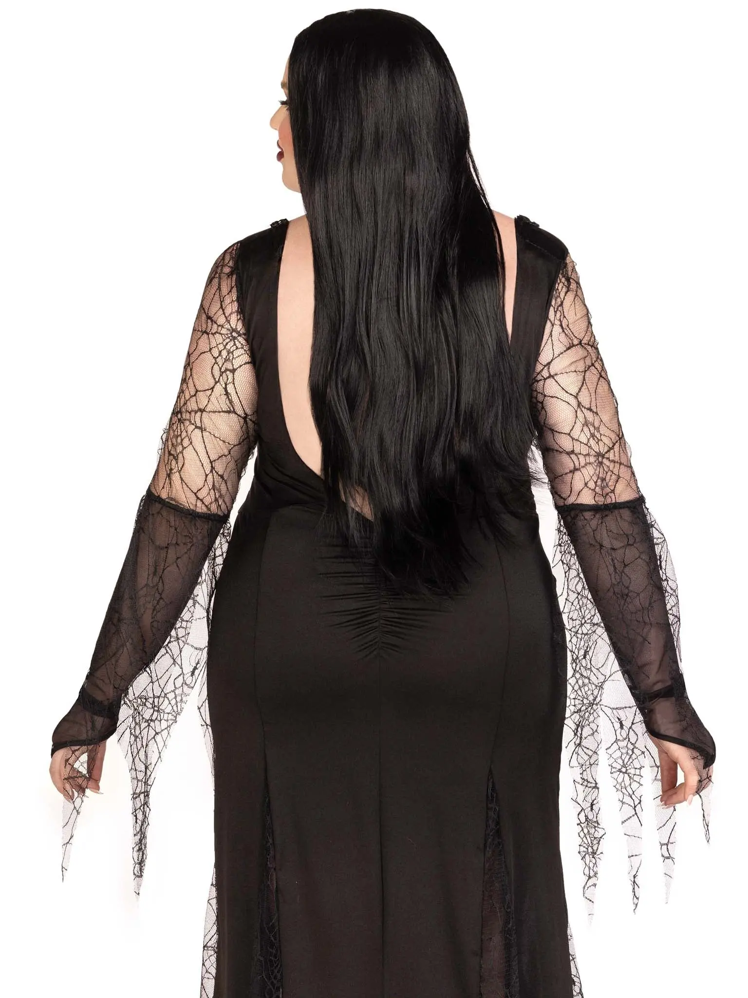 This divine diva needs no introduction. Finger snaps for the Spooky Beauty plus size Halloween costume by Leg Avenue. A dress superbly fit for the queen of darkness, this sexy costume look features a backless deep-v dress with sequin trim and ruched back, spiderweb gauntlet sleeves, and high slit tentacle skirt. Find your cara mia for the ultimate couples costume.