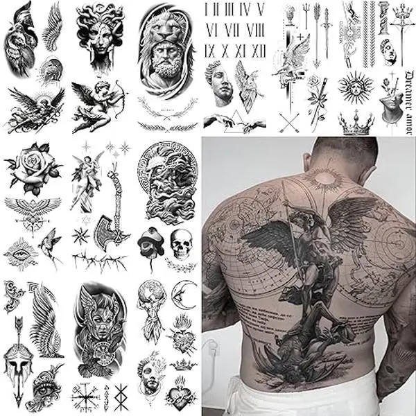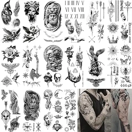 Modern Masuline Full Sleeve Semi Permanent Fake Tattoos for Men - Geometric Greek, Roman, Viking Gods & Goddess, Bird Wings, Axe, Knight - Large Realistic Temporary Tats for Guys