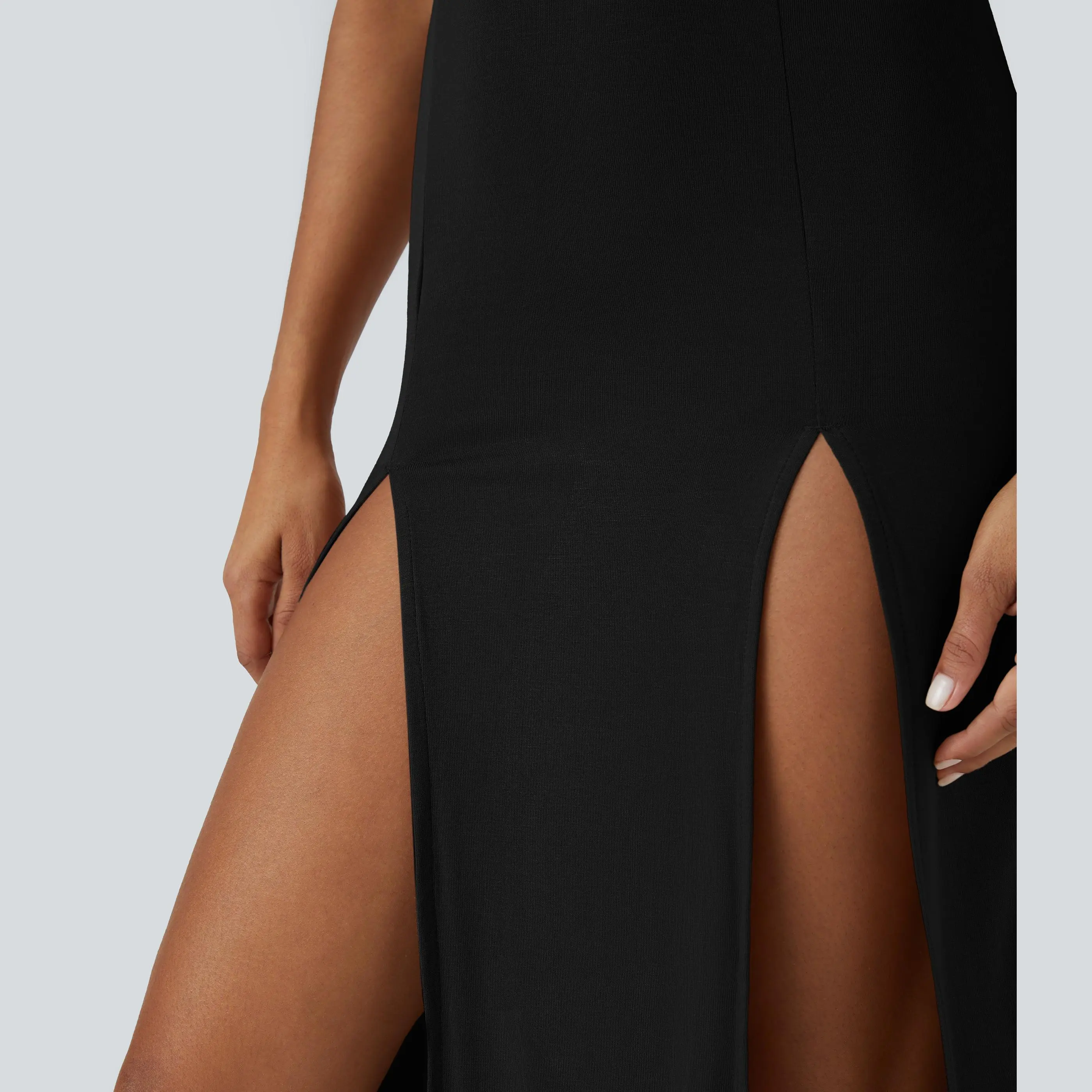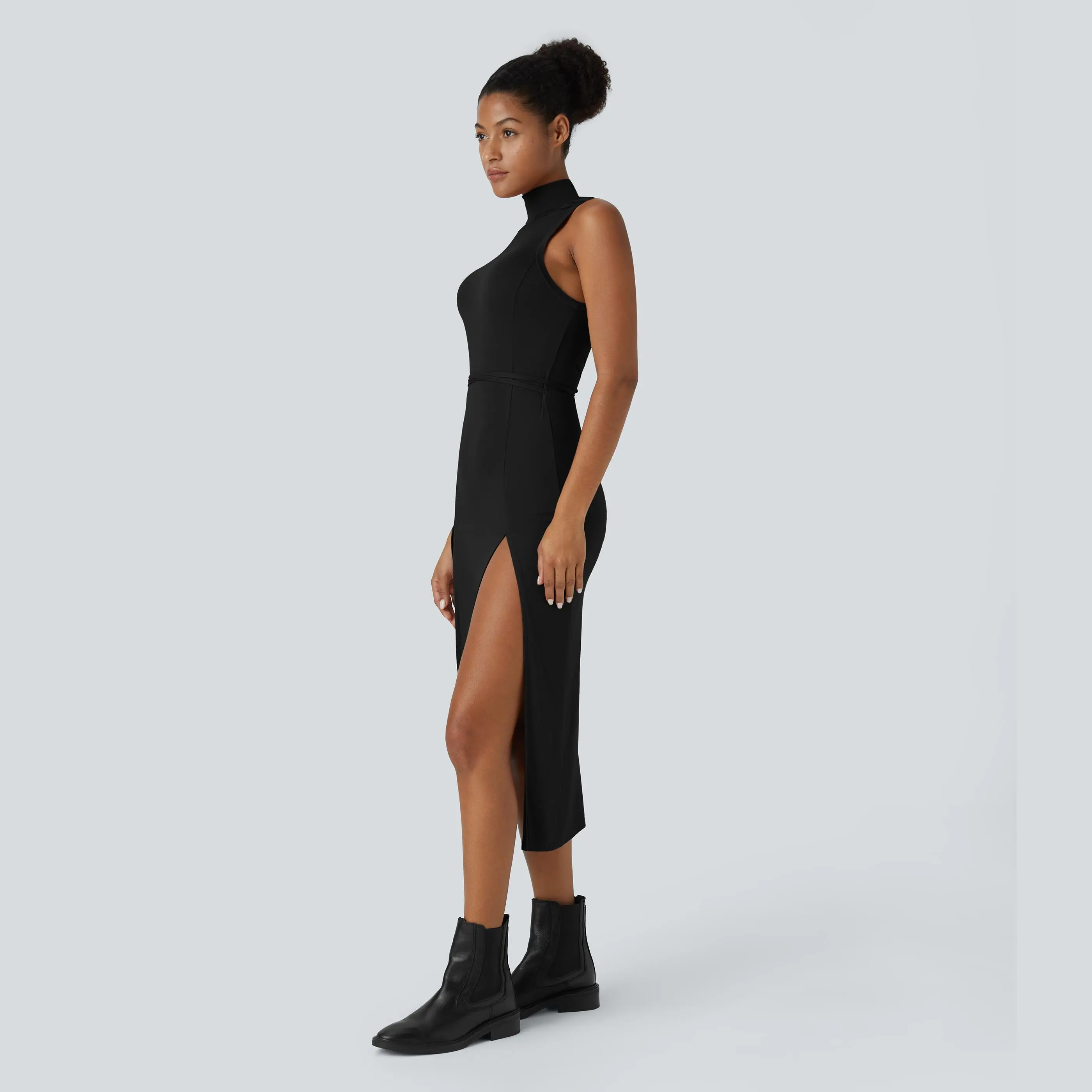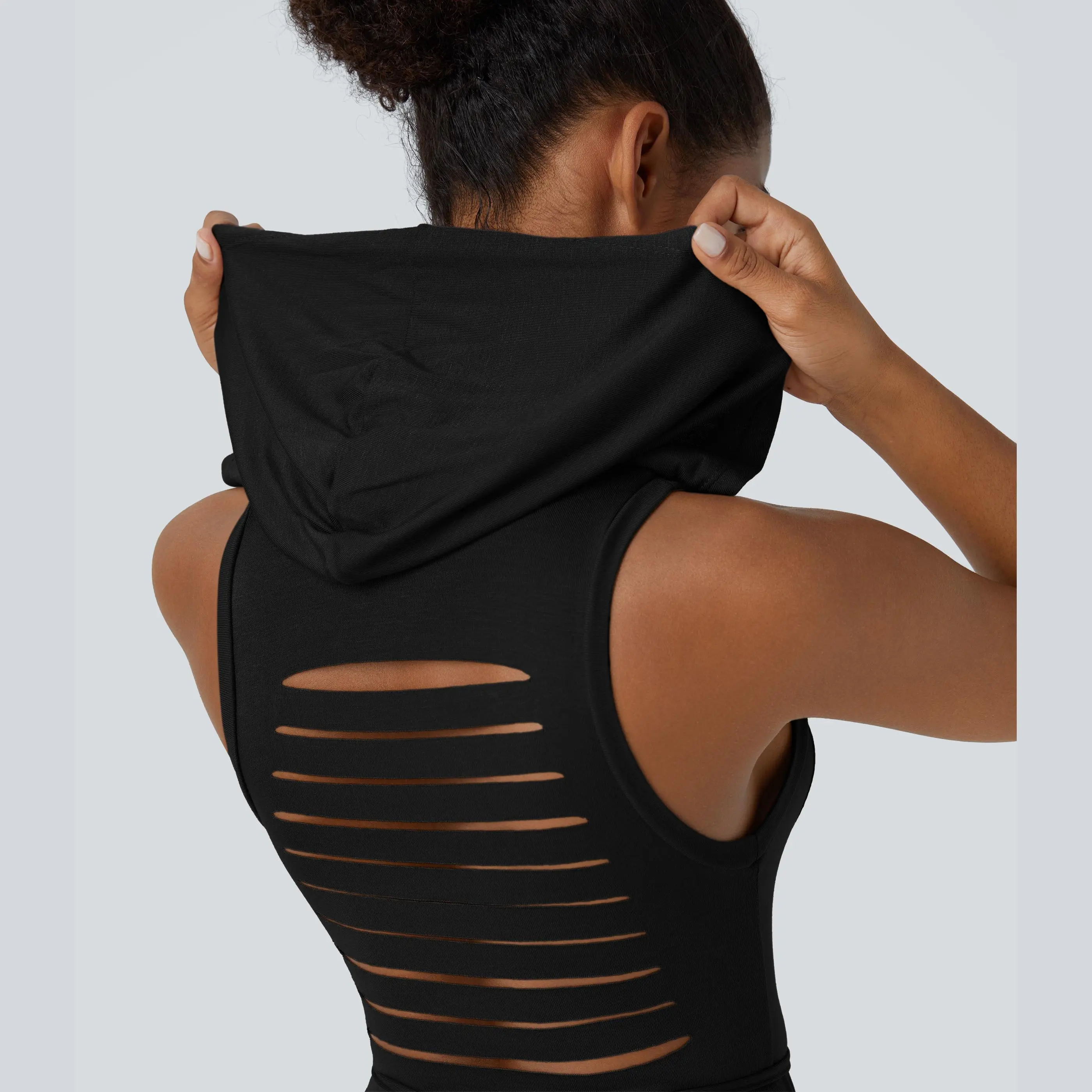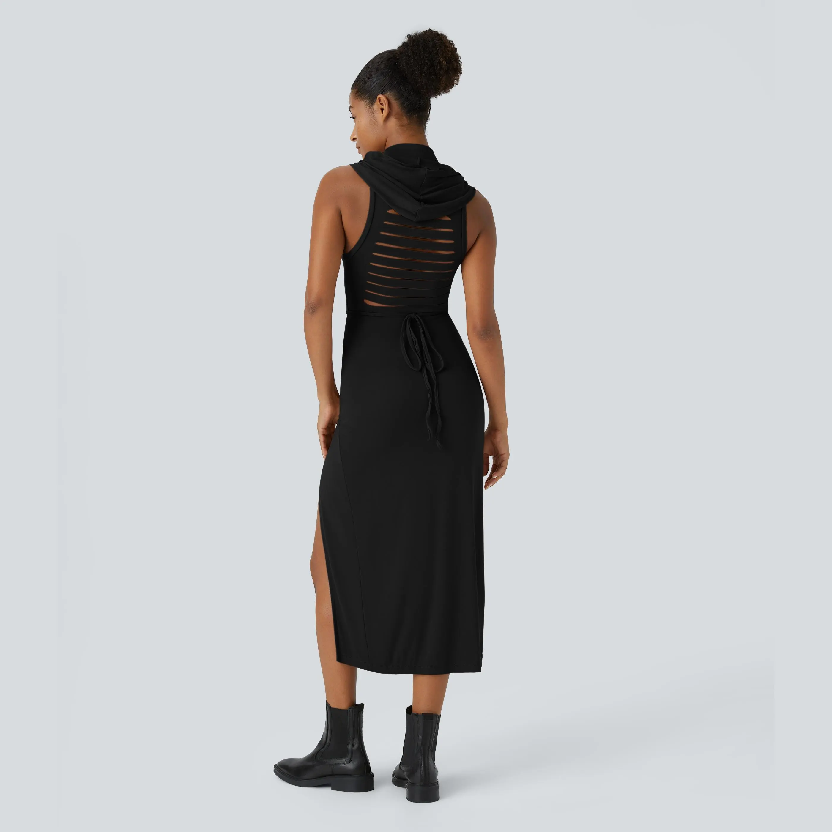 Halara Women's Ribbed, Hooded, High Neck, Sleeveless, Cut Out, Tie Back, Split 2-Piece Midi Casual Dress