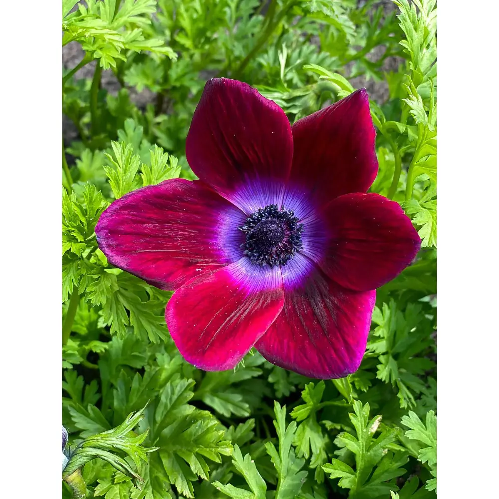 A fabulous anemone with deep red petals and a purple heart. Bourdeaux's blossoms are beautifully shaped and flutter like poppies in the wind. Finely-cut foliage complements the blooms, then dies back during summer while the plants are dormant. The flowers last for up to two weeks in a vase. In zones 7-10 anemones may be planted in fall for spring flowers. In colder zones they can be planted in spring for late summer flowers.