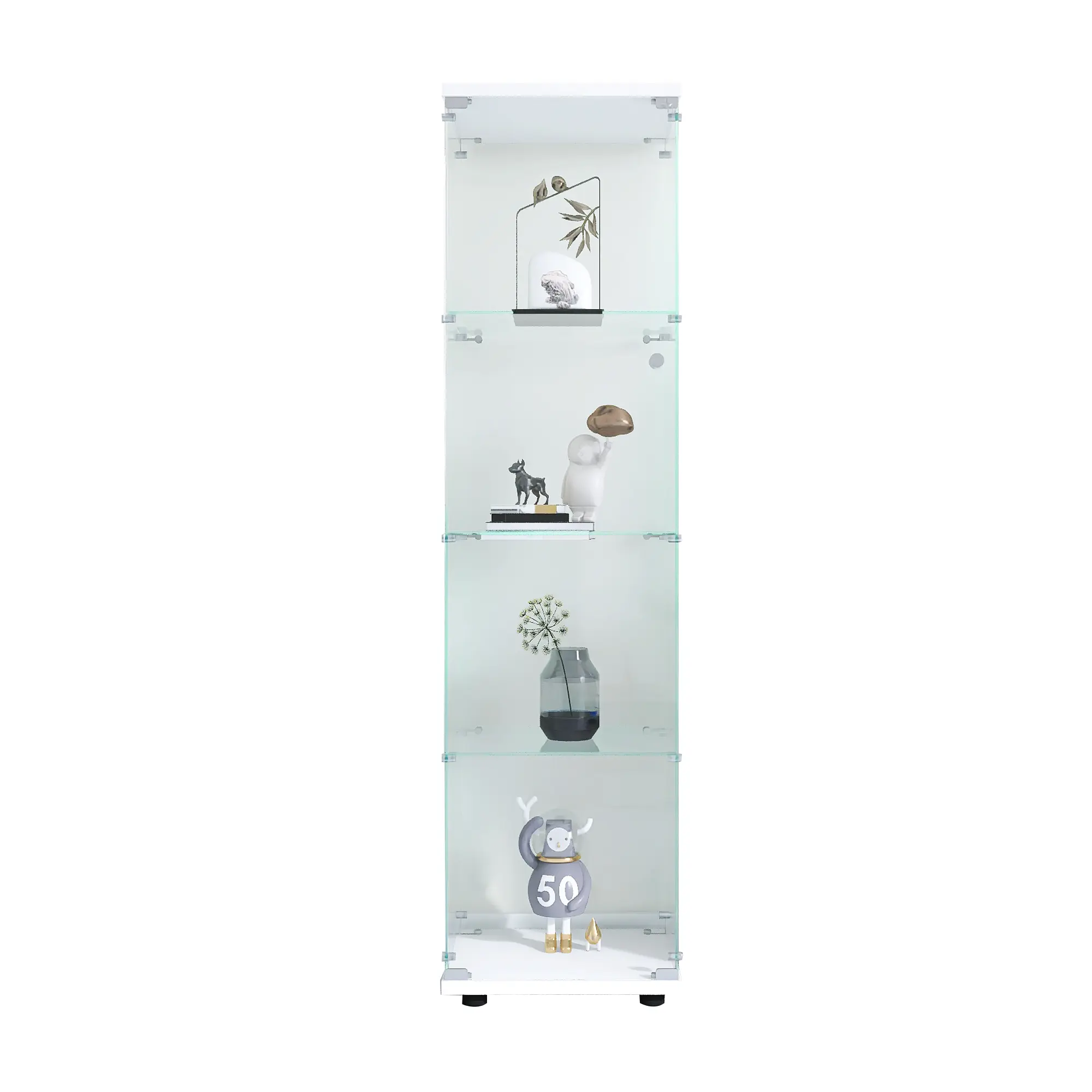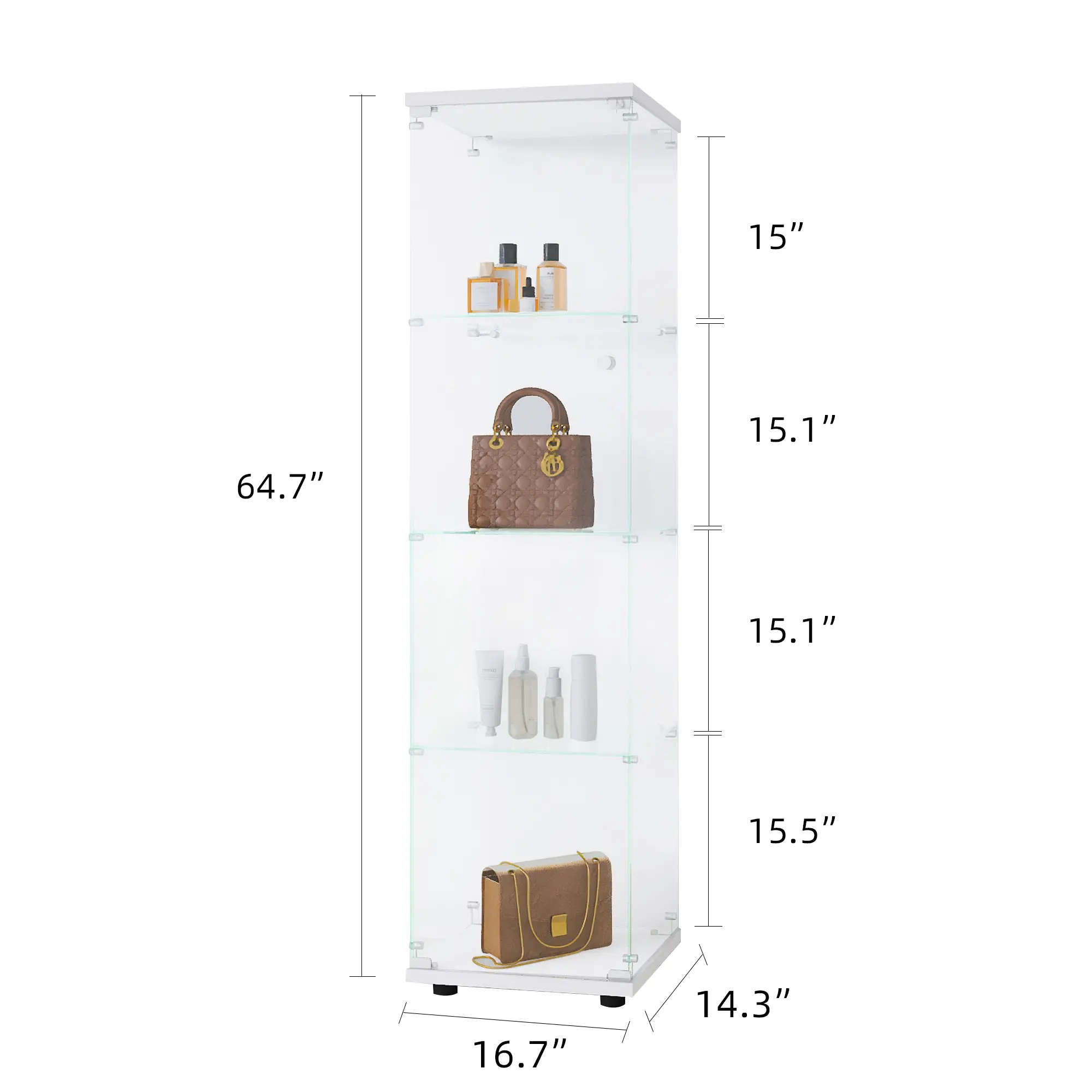 ·Glass Display Cabinet: Size 64.7" (H) x 16.7" (L) x 14.3" (W) inches. 4mm thick tempered glass. 4-shelf design for displaying photos, books, action figures, wine, and whisky. Glass door is easy to open and close.