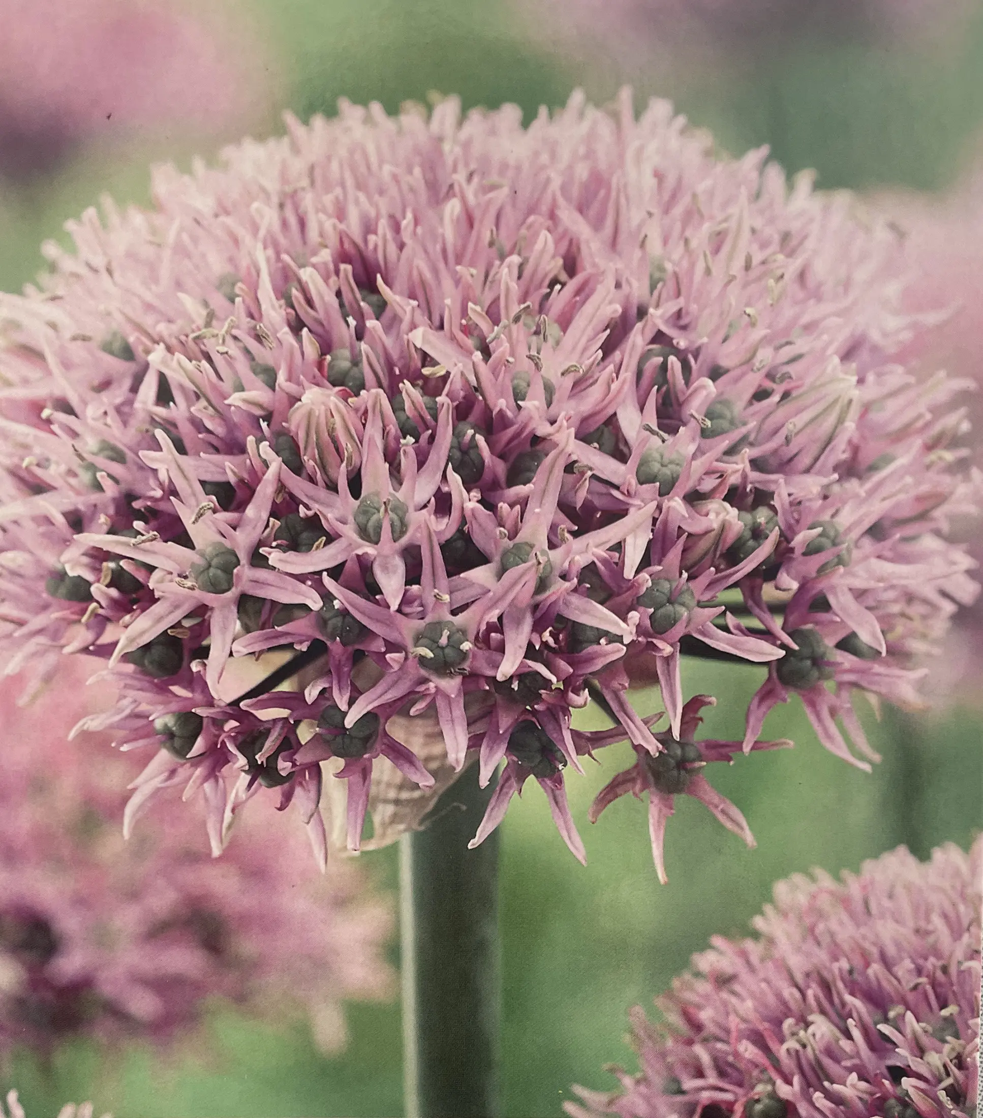 Lilac-pink flattened globes of star-shaped florets dotted with green eyes float above the foliage. Plant Allium New York with some of the classic blue Alliums for sparkling color contrast. Alliums usher in summer just when spring Daffodil and Tulip bulbs are finished for the season. Their beauty supplies color with interesting flower shapes to create a garden design with texture and depth. Also known as Ornamental Onions, they are equally lovely when they dry on the stems and go to seed. Even smaller gardens can accommodate their vertical presence.
