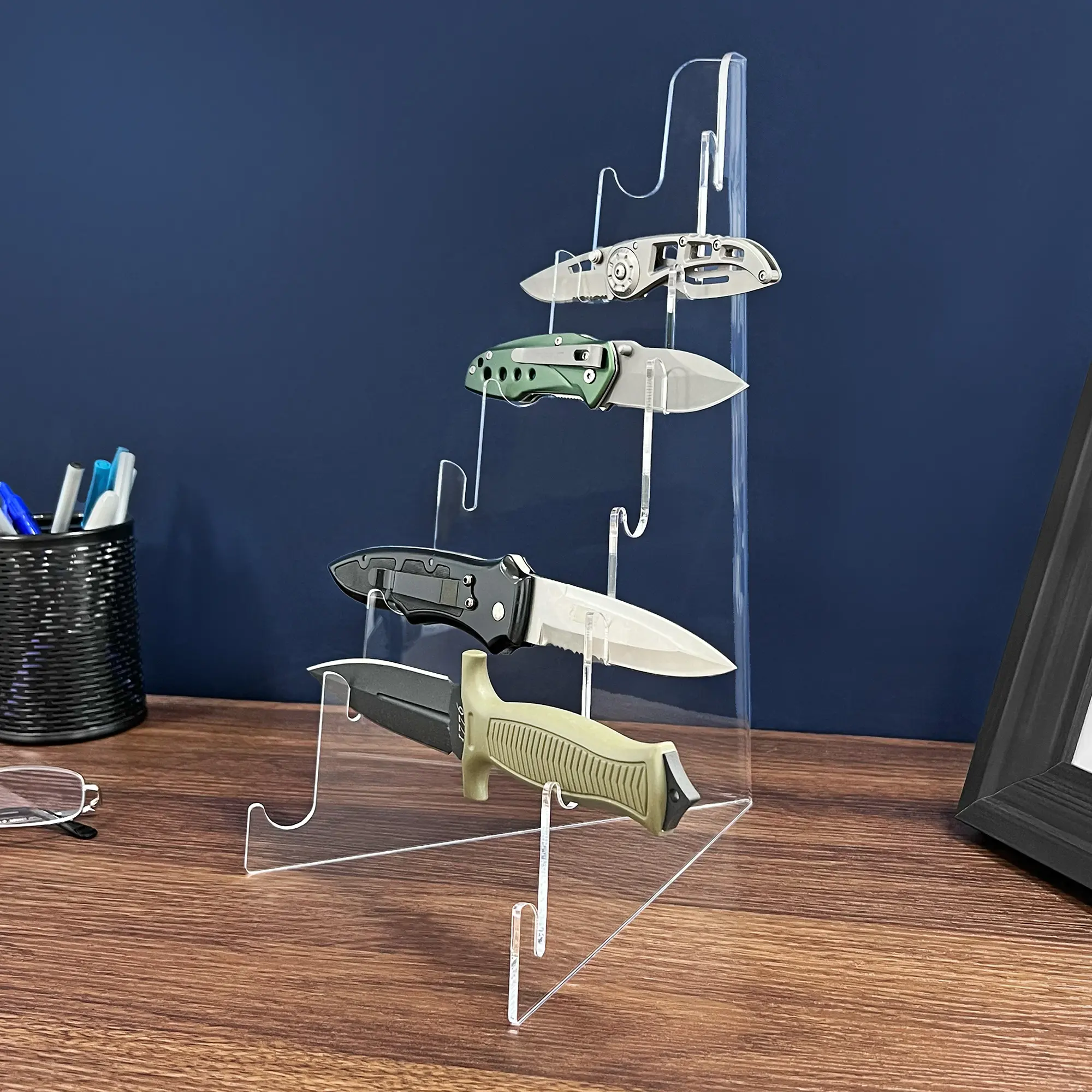 How to Use? Our acrylic knife display holder rack is a versatile solution that enhances knife organization and presentation in various settings. Whether in a professional kitchen, a home kitchen, or a retail environment, this rack provides safe and organized knife storage, allowing you to easily access and select the right knife for your culinary tasks. For professional chefs, cooking enthusiasts, and restaurant owners, it offers an elegant and efficient way to showcase high-quality knives. In home kitchens, it ensures safe and organized knife storage and display. In a retail setting, this display rack is perfect for presenting knives to customers, making it simple for them to view and choose the blades they prefer. Enjoy the convenience, efficiency, and elegance this display rack brings to your knife storage and presentation needs.