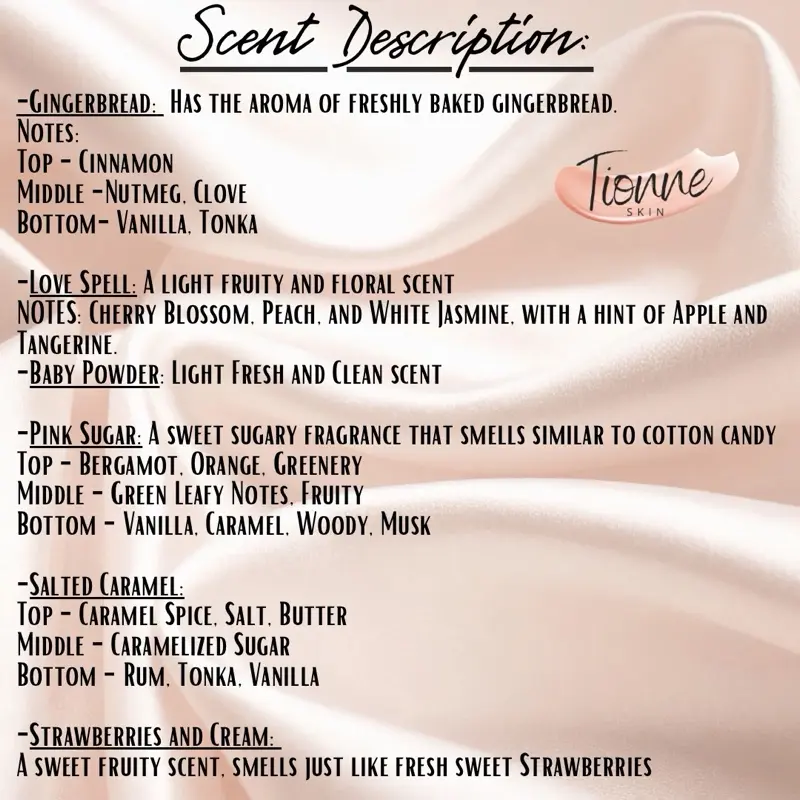 Love Spell scent: A fruity and floral scent. NOTES: cherry blossom, peach, and white jasmine, with a hint of apple and tangerine.