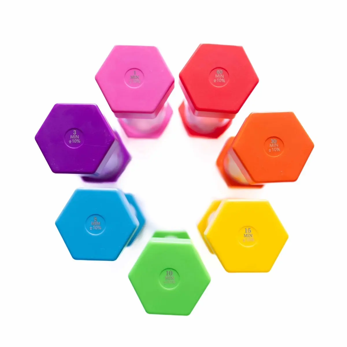 Rainbow Order: In every set, each color corresponds to a specific sand timer duration: for instance: 60 minutes in bold red for screen leisure time, 30 minutes in warm orange to encourage focused activities, 15 minutes in cheerful yellow for timed challenges, 10 minutes in calming green for study sessions, 5 minutes in soothing blue for creativity breaks or transitions, 3 minutes in imaginative purple for quick tasks like brushing teeth, and 1 minute in playful pink to teach time increments. Ideal for calm corners for classrooms, homes, and offices as they add a practical and visually delightful element to any setting.