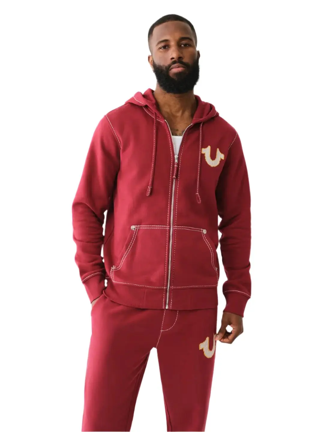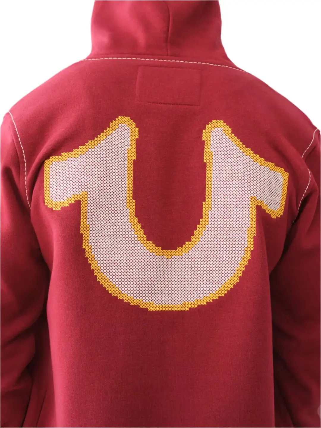 Stay cozy in this fleece-lined Big T Cross Stitch Zip Hoodie. Equipped with a drawstring hood, zip-up front, and kangaroo pocket, this hoodie is perfect for chilly days. Show off the iconic Big T stitching and horseshoe logos with a playful twist (horseshoe pun intended).
