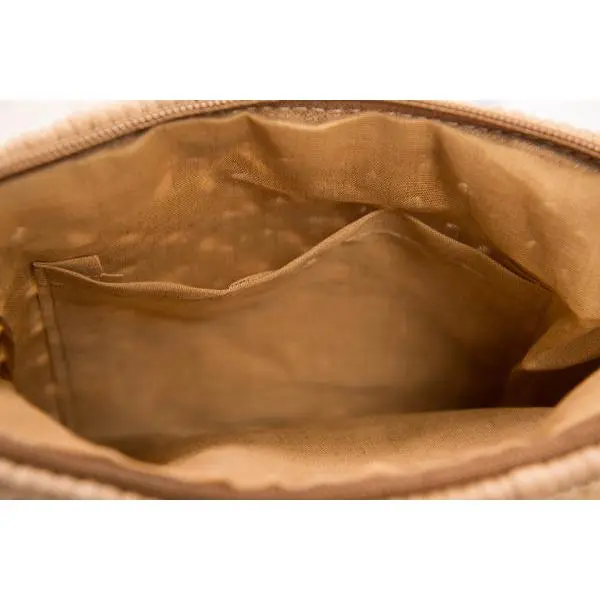 Macrame Woven Design Measurements: 9.5"x7.5" Material: 70% Cotton/30% Polyester Fixed Crossbody Strap Measures: 46" Tassel Accent Cotton Linen Lining Interior Open Sidewall Pocket Zip Top Closure