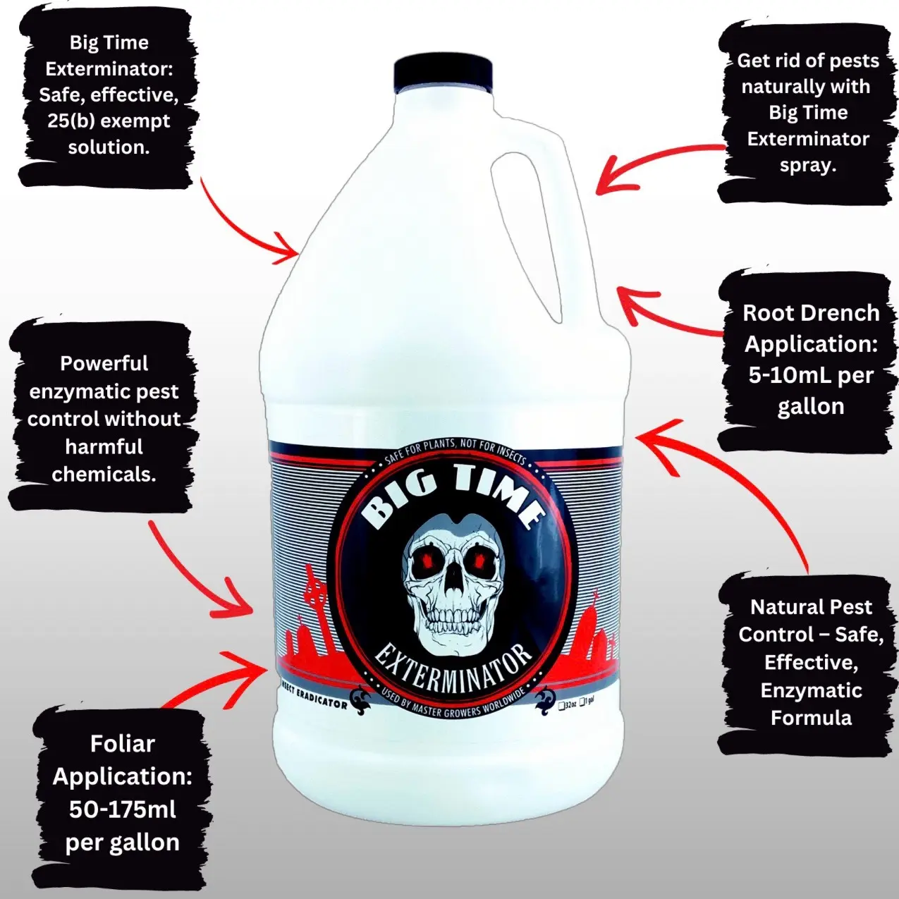 Big Time Exterminator is a foliar application that can be used in gardens indoors or outdoors on vegetables or ornamentals. The recommended dosage for this product is 50-175ml per gallon, depending on the severity of the infestation.