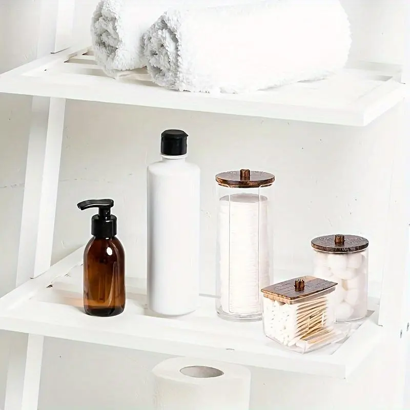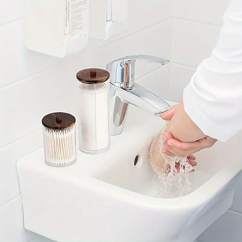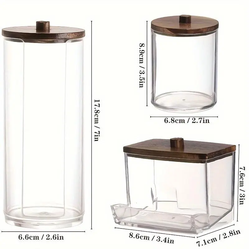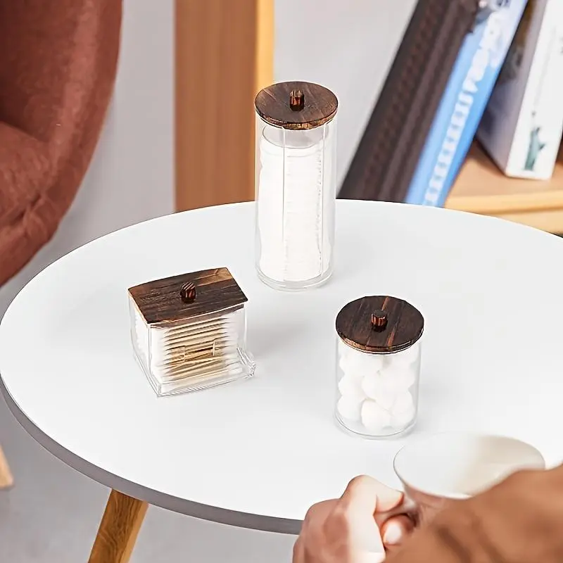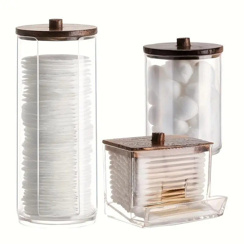 Clear Storage Box with Wooden Lid, 3 Counts Cotton Balls Cotton Swabs Storage Box, Household Storage Box for Home Dormitory Bathroom Hotel, Bathroom Counter Organizer