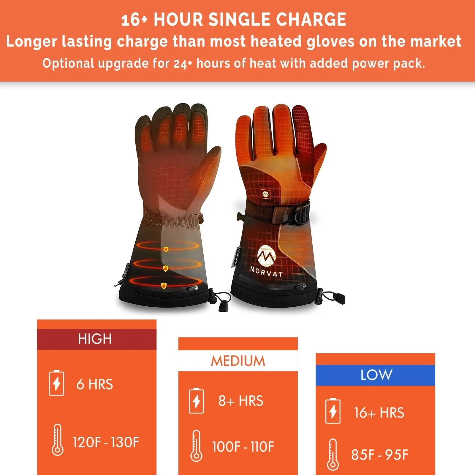 Experience 16+ hours of warmth with Morvat's heated winter gloves. Made with genuine leather and a non-slip grip, these gloves offer breathability and flexibility. The soft cotton and 3m Thinsulate inner cushion ensures uniform heating. With three settings and an optional power pack for extended warmth, these gloves feature touchscreen compatibility, snow-resistant toggles, water resistance, and hands-free straps. Ideal for all cold activities, backed by a 1-year warranty.