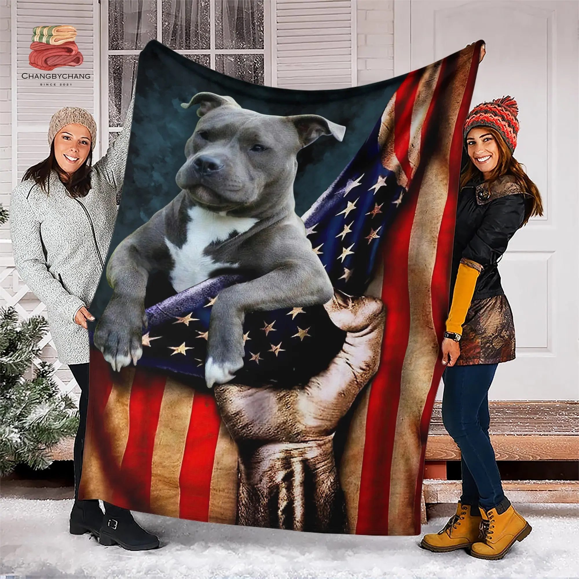 Grey Pitbull American Flag Fleece Blanket, Premium Sherpa Blanket, Pitbull Blanket, Pitbull Quilt, Dog Blanket, US Flag Blanket