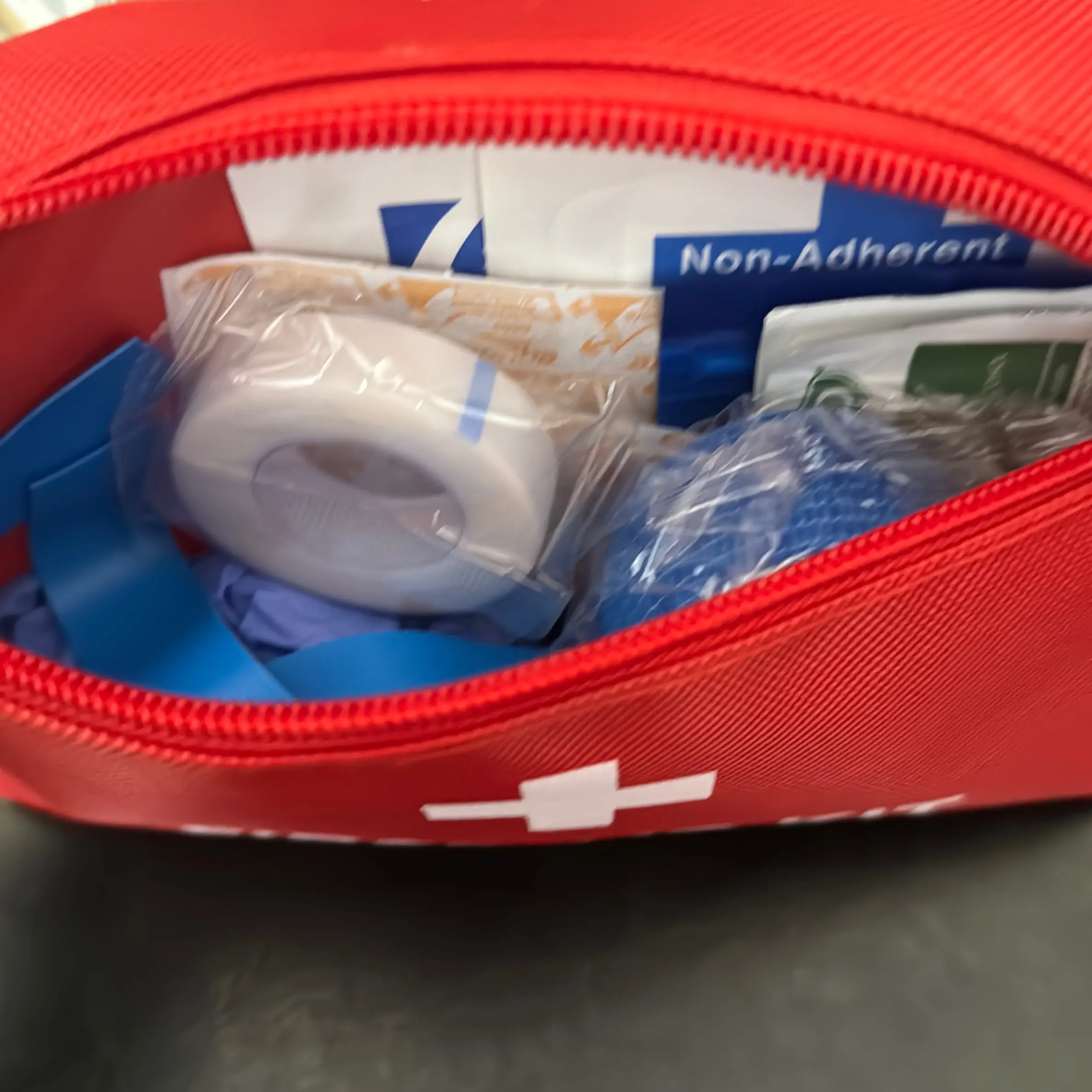 First aid kit, customized with your logo or info, filled with sterile pads, alcohol pads, scissors, tweezers, tape, tourniquet, bandages, safety pins, and gloves.
