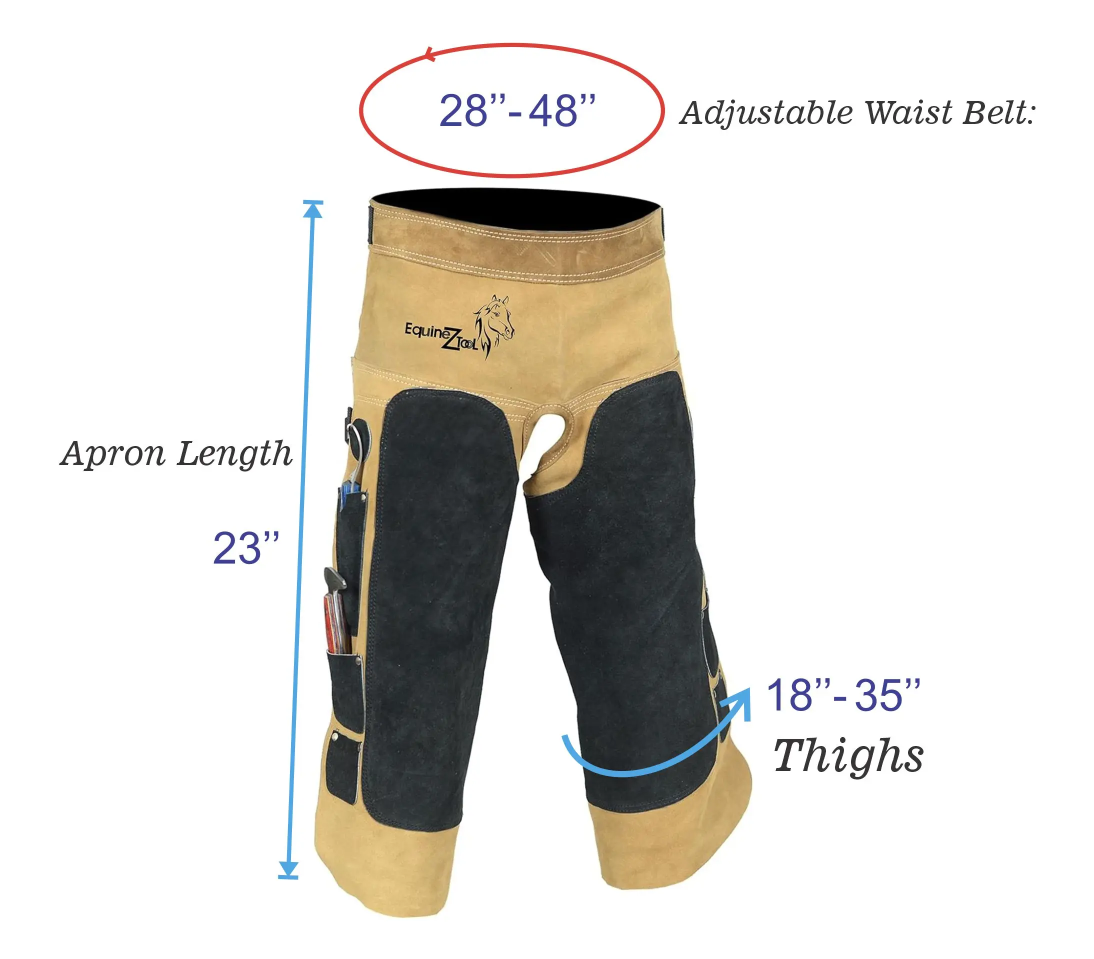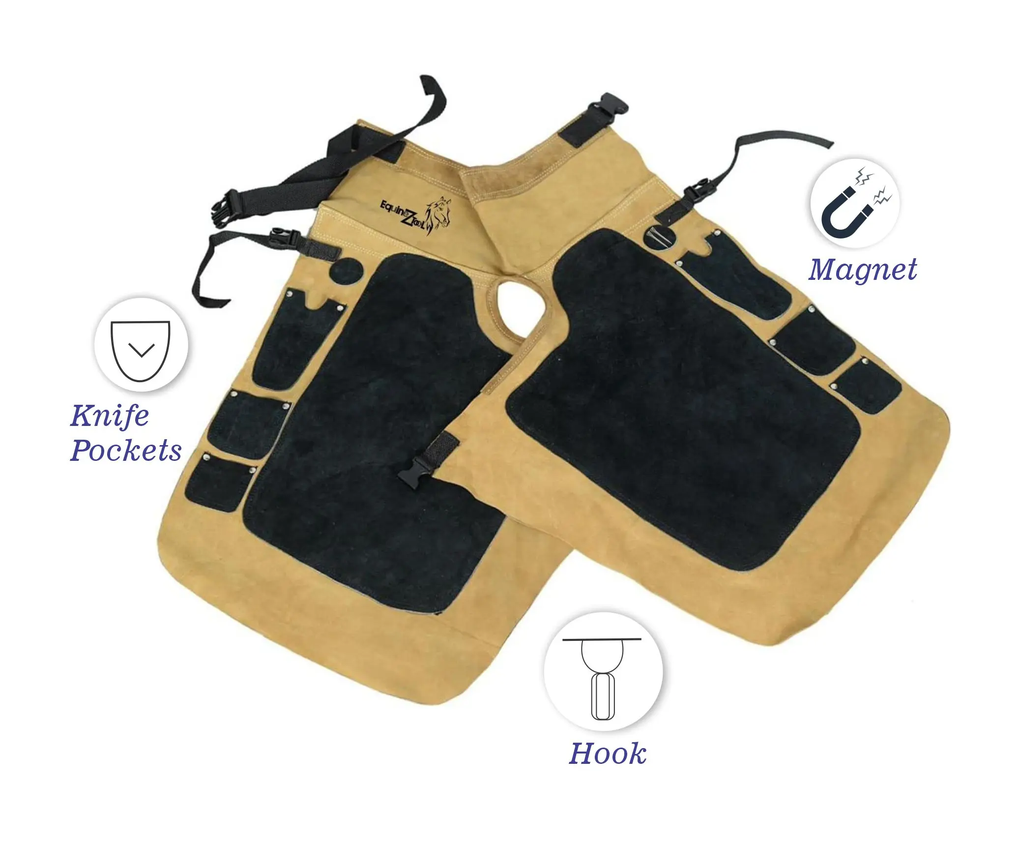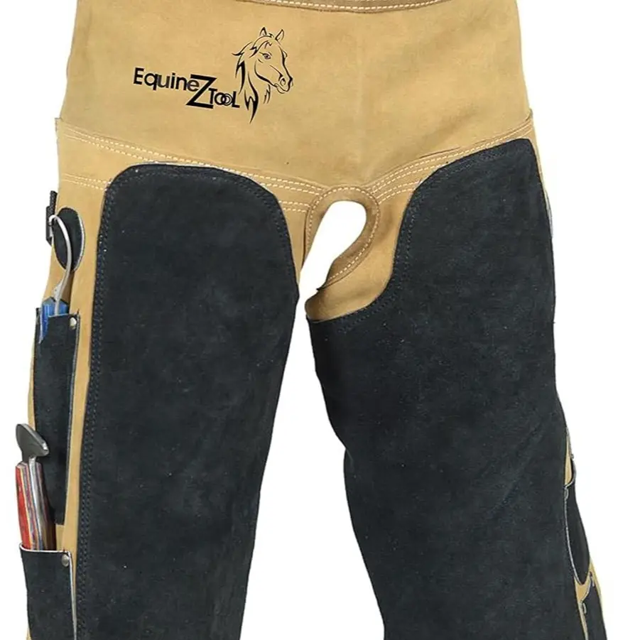 ·Equipped with 2 knife pockets, 2 nail magnets and 2 Hammer Loop. Leather Chaps have ample space to store essential Farrier Supplies. Farrier Chaps help you keep track farrier tools and other small metal items, saving you time and effort.