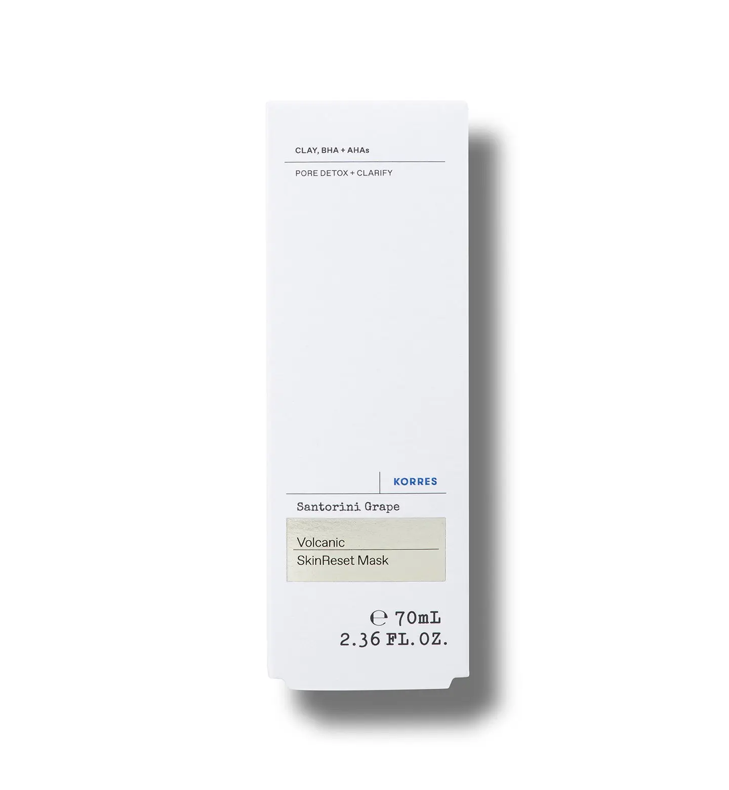 A lightweight and easy to spread clarifying volcanic sand mask. With encapsulated activated charcoal that targets enlarged pores and removes excess oil from the skin and a powerful blend of Santorini Grape Extract, white + green clay, AHAs + BHAs.