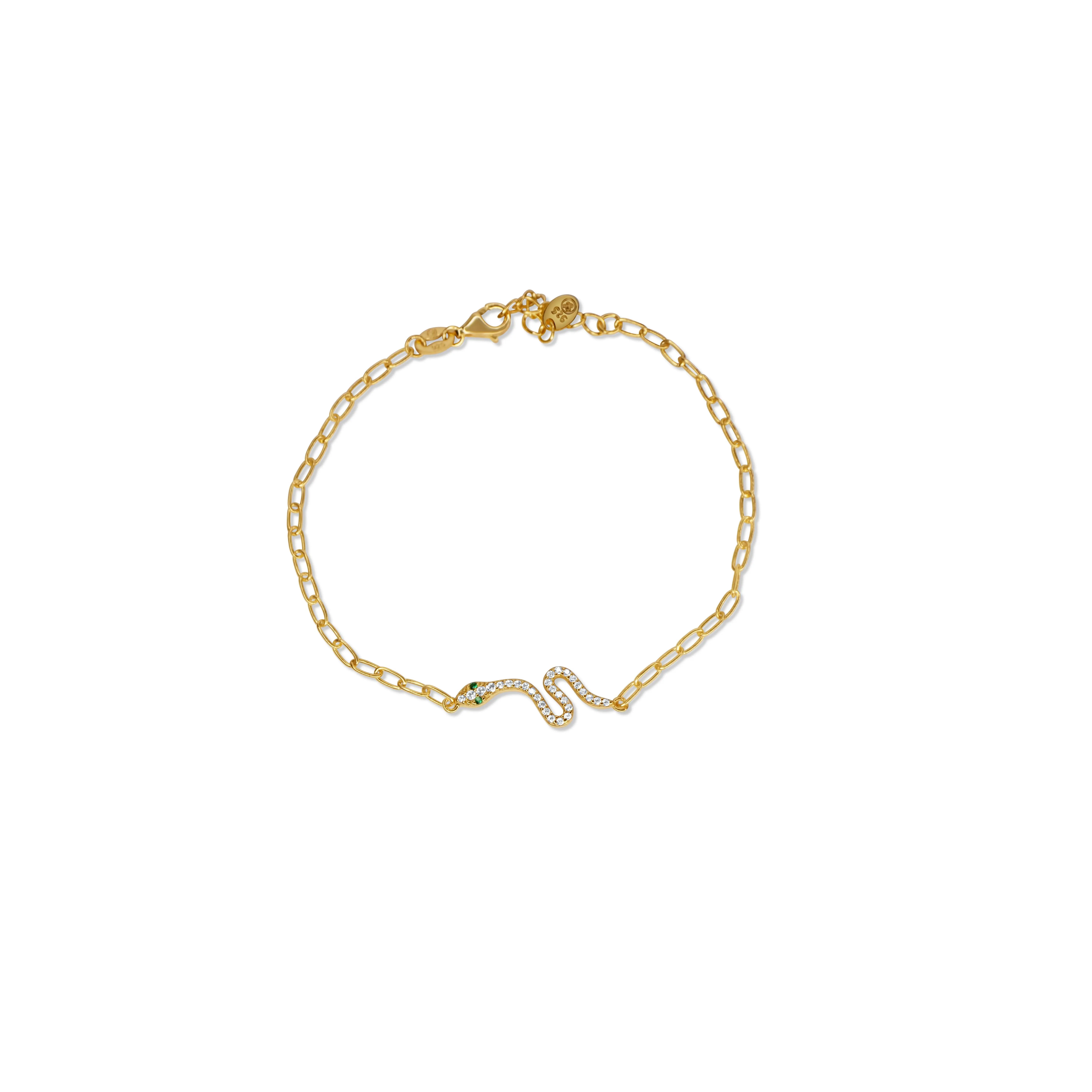 This beautiful bracelet features a gold snake charm with diamonds and emerald eyes. The snake is a symbol of wisdom, fertility, and rebirth. The diamonds represent wealth and power, while the emeralds represent love and hope. This bracelet is the perfect way to add a touch of luxury and glamour to your look. The snake also symbolizes seductive beauty, it is quiet, yet mesmerizing while garnering the attention of all.