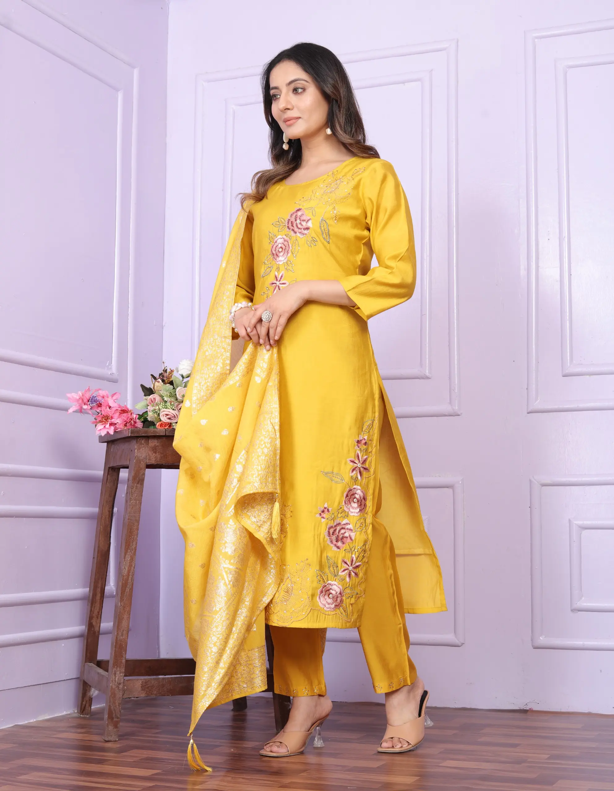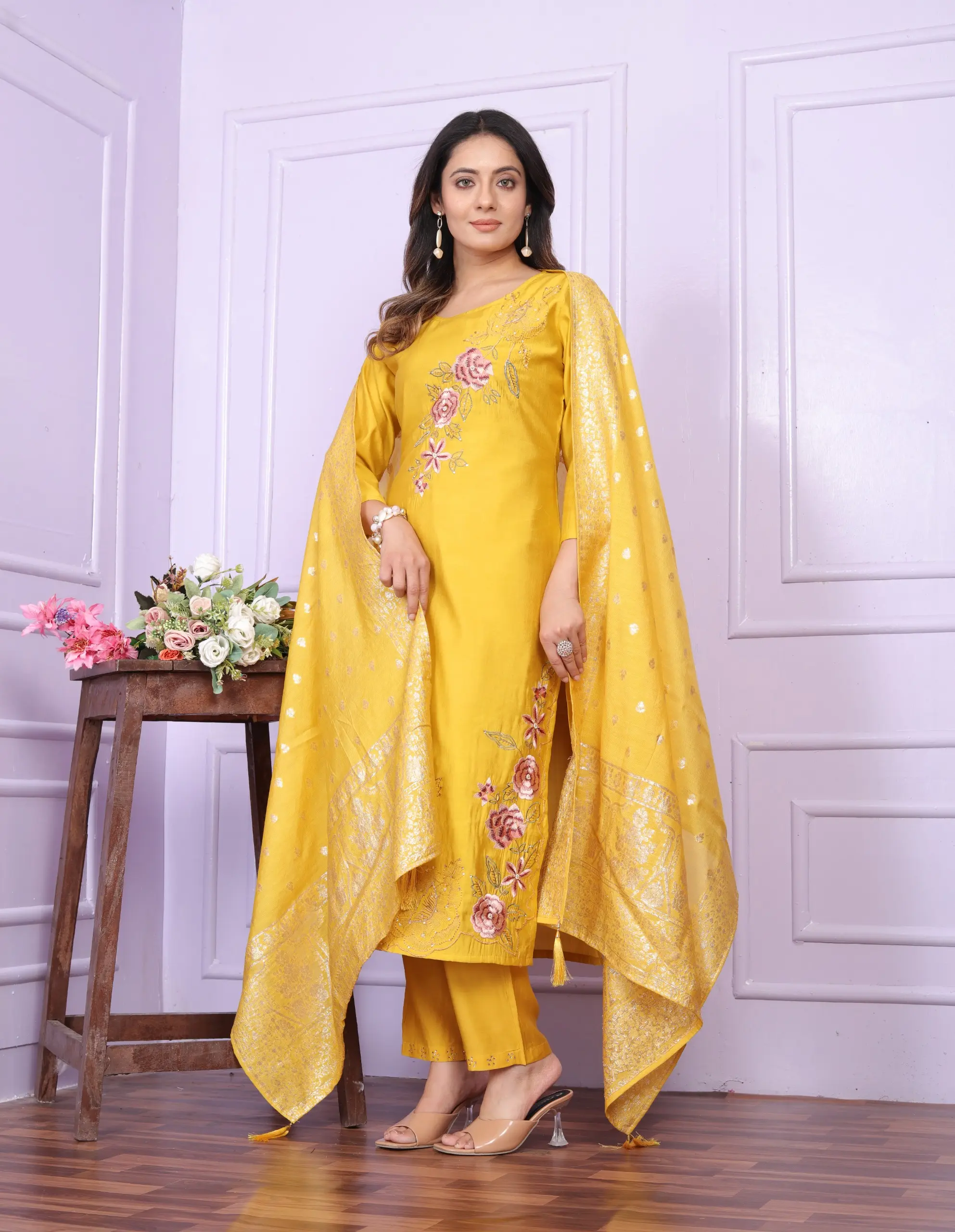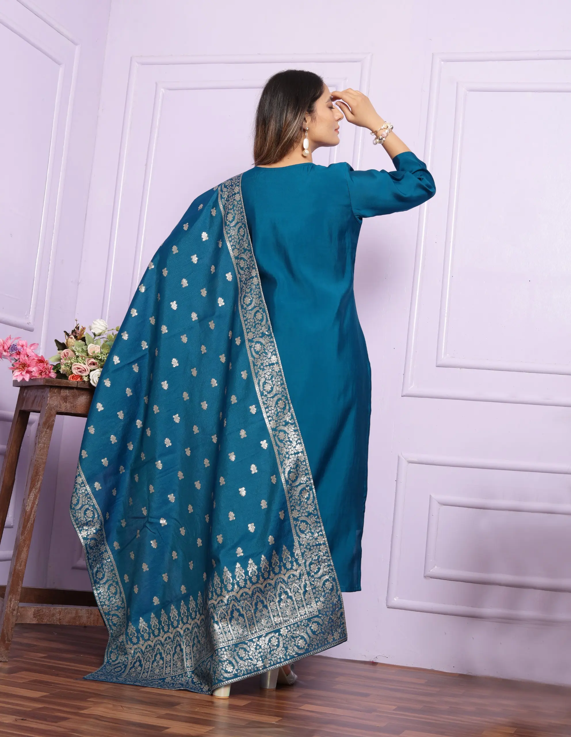 ·Design: Features a round neck straight kurti with banarasi dupatta adorned with tassels.