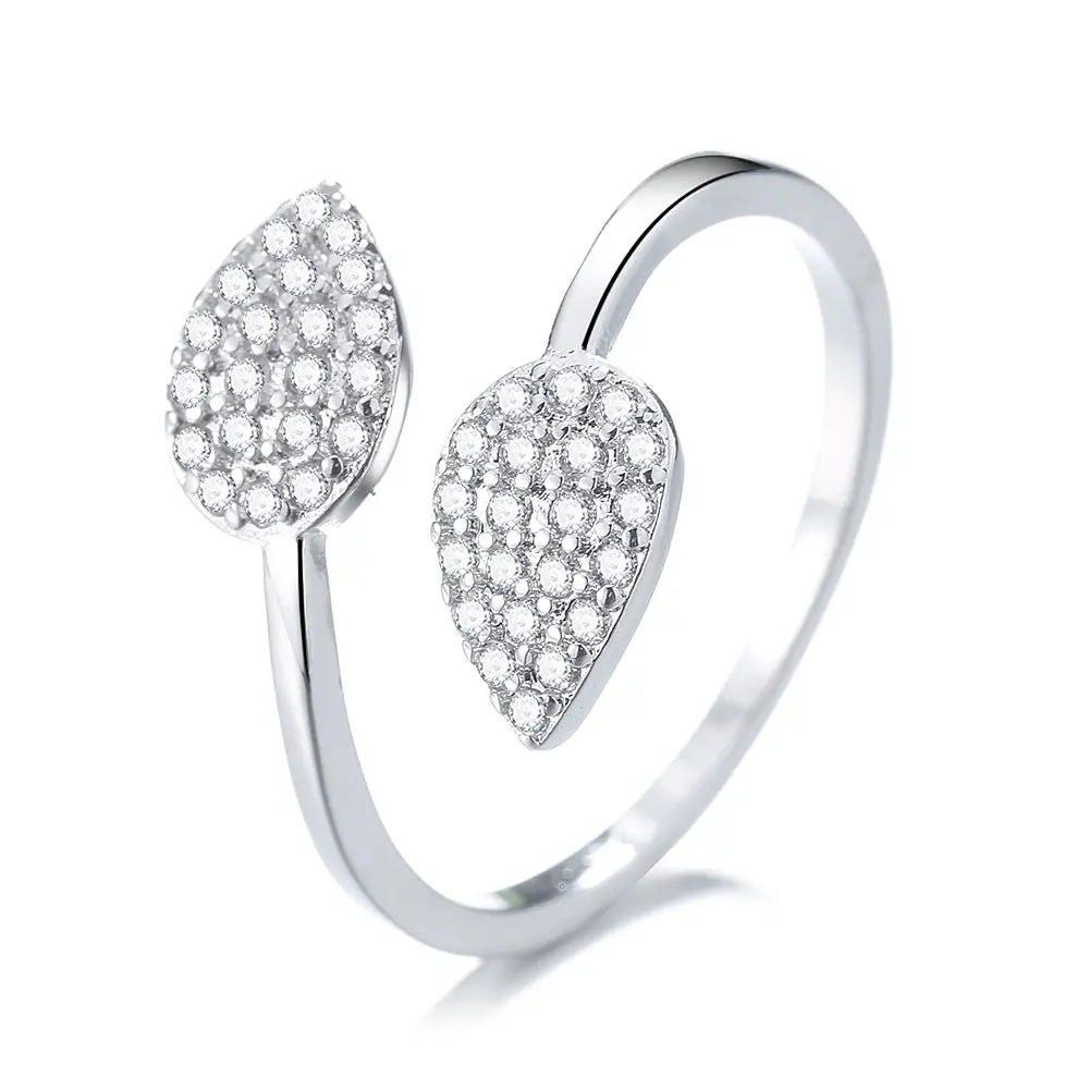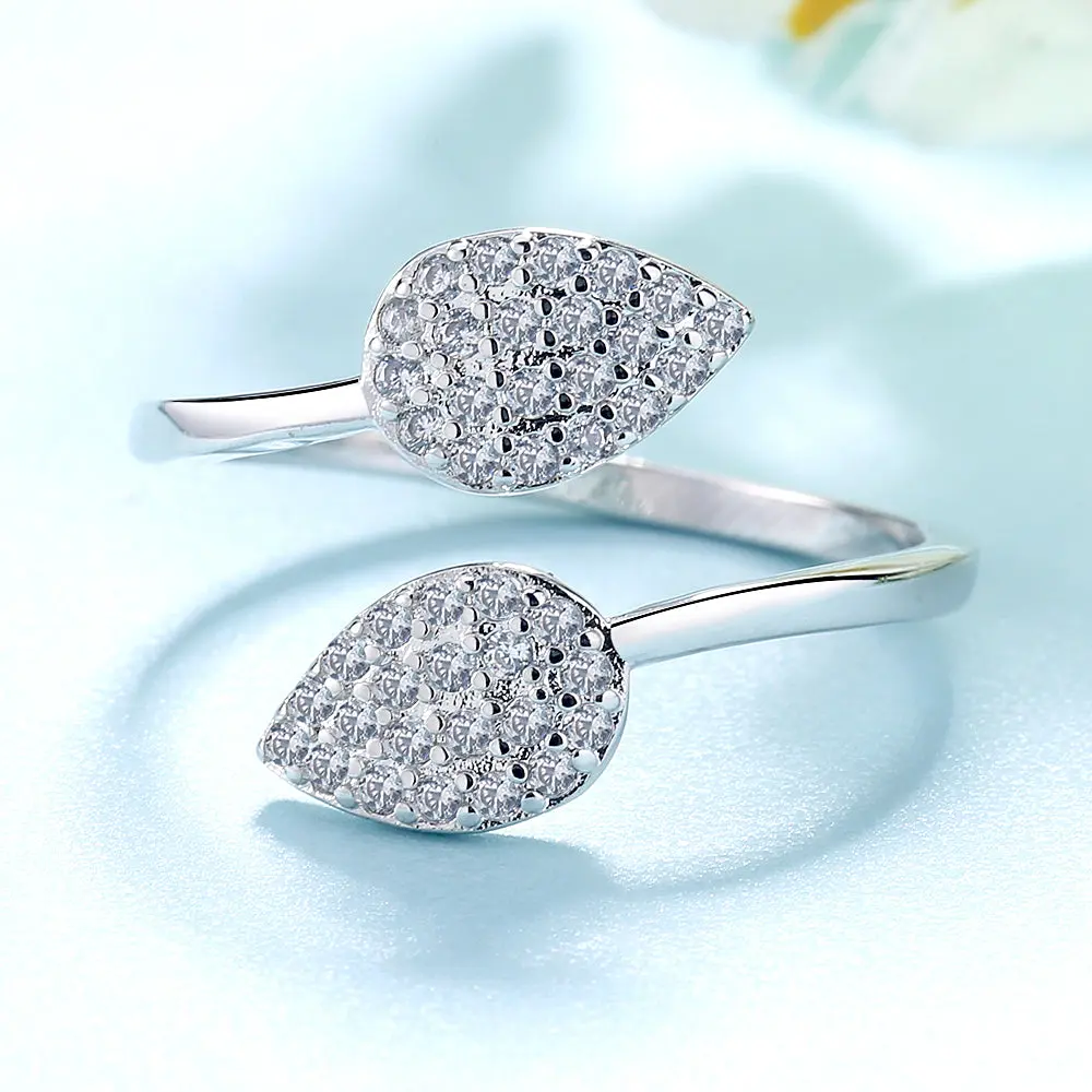 At the center of the ring, there are two delicate leaves made from silver and adorned with sparkling Swarovski crystals. The leaves curve around the finger, creating a beautiful and organic flow to the piece.