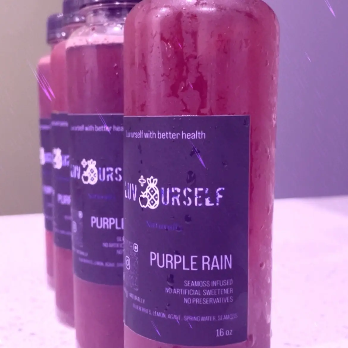 Purple rain blueberry lemonade, infused with Seamoss Delicious and nutritious containing 92 vitamins and minerals everything the body needs to perform in optimum condition