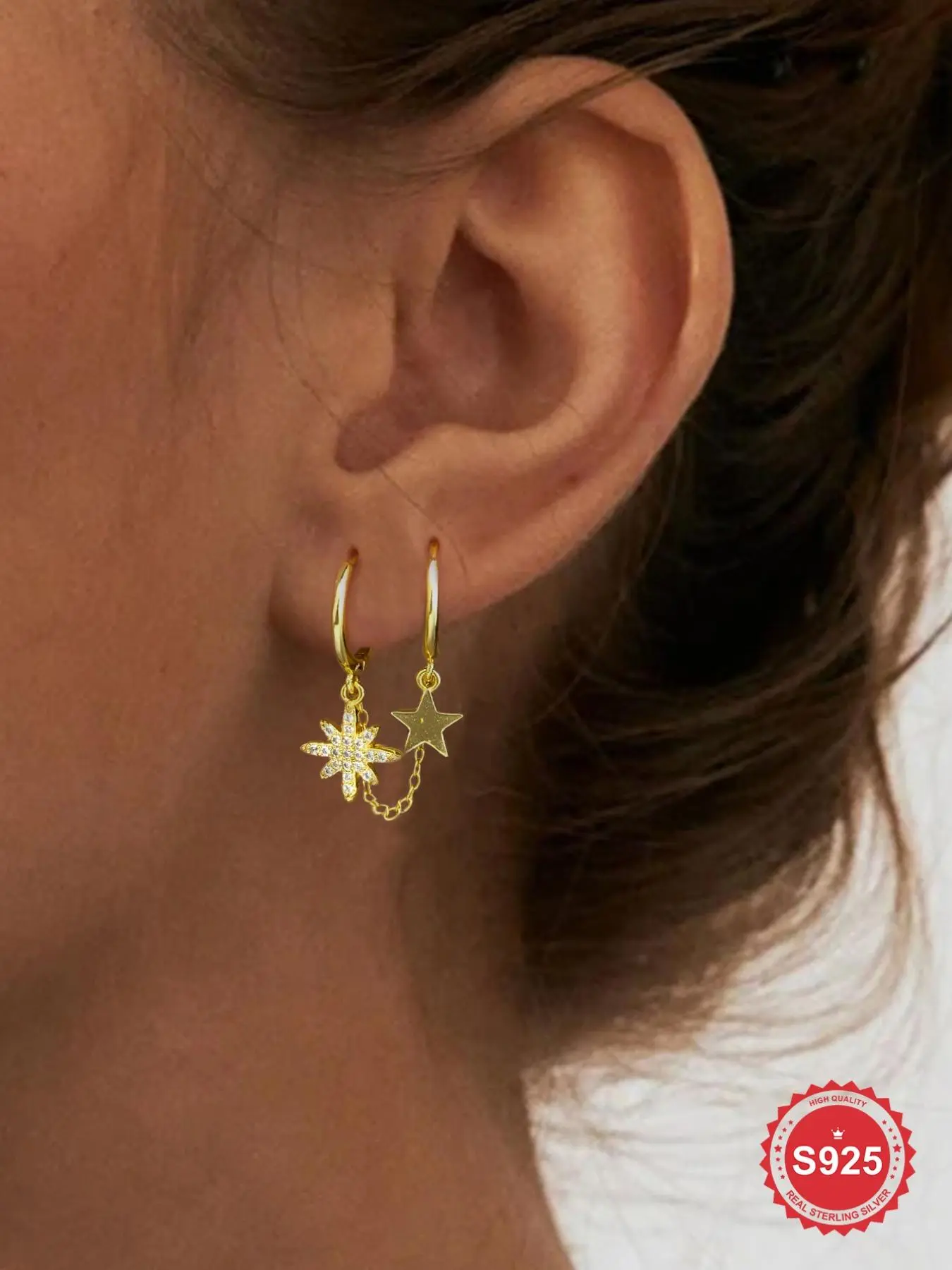 925 Sterling Silver Chain Design Earrings, Double-Threaded Eight-Pointed Star Zircon Drop Earrings, Stud Earring for Women, Fine Jewelry Gift, Elegant Minimalist Earrings