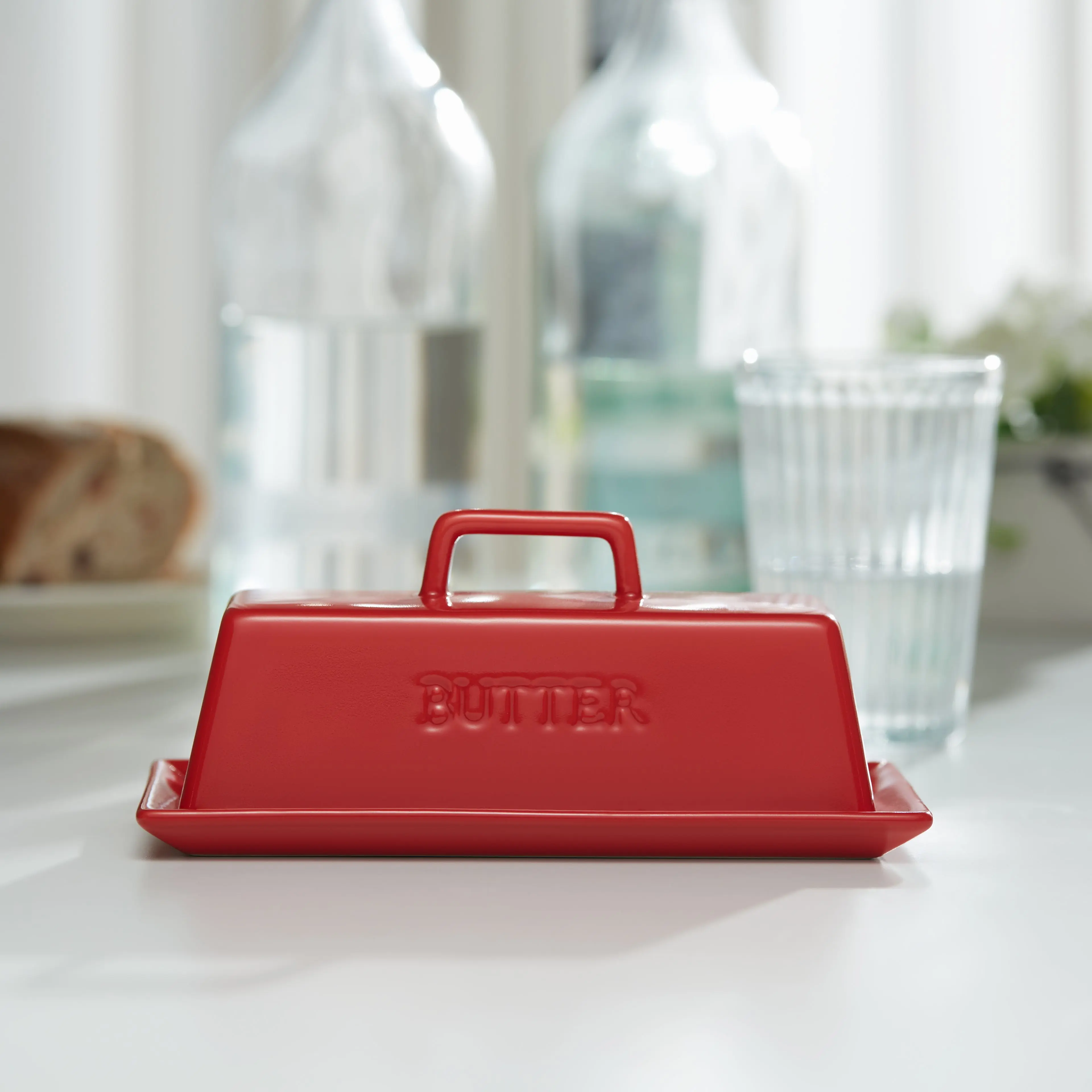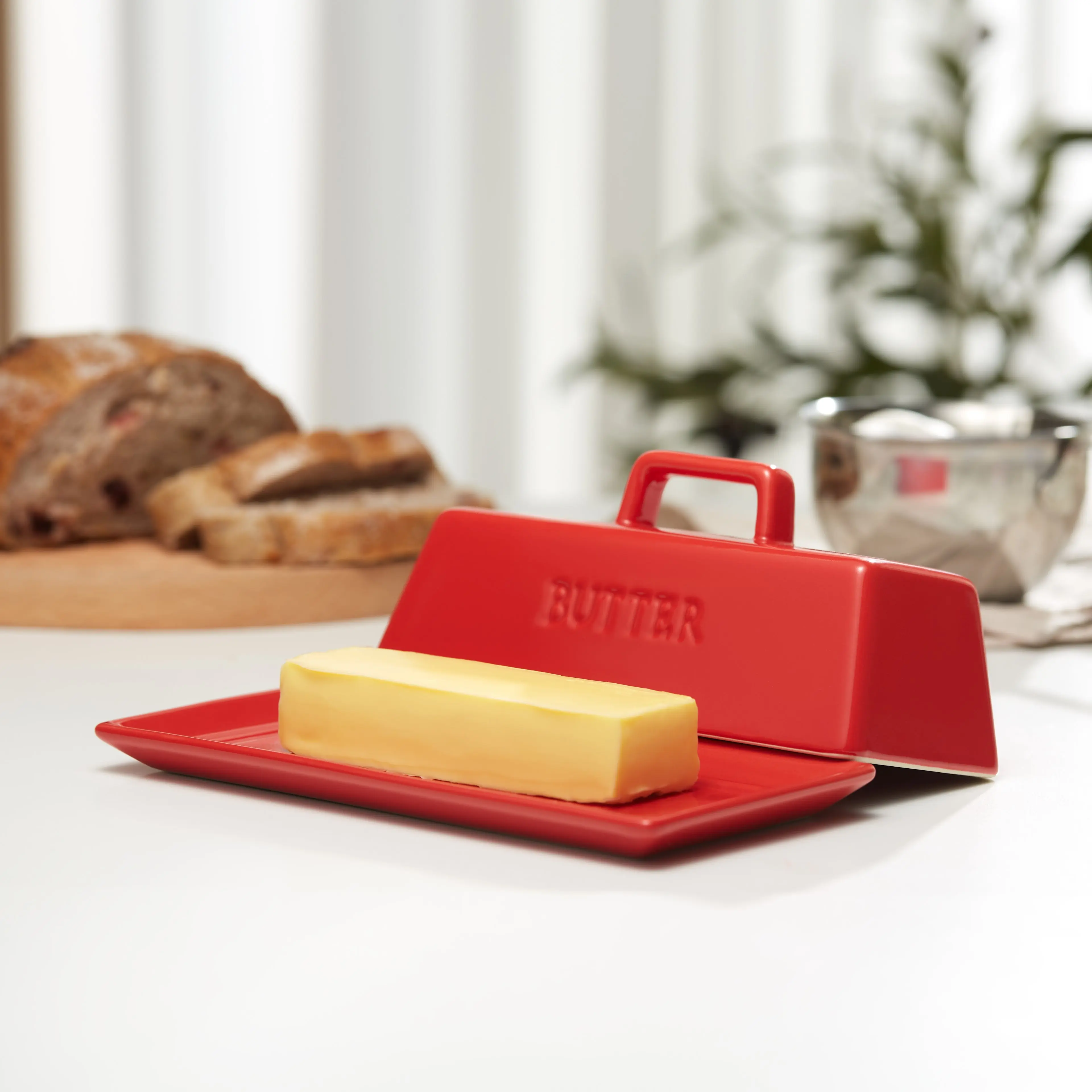 This isn't your grandma's butter dish. But it could be. It's classic, sturdy, and holds one standard stick of butter. The top handle makes it easy to lift the lid, and the squared design allows you to rest the lid on its side while you smother those biscuits in melty, golden goodness.