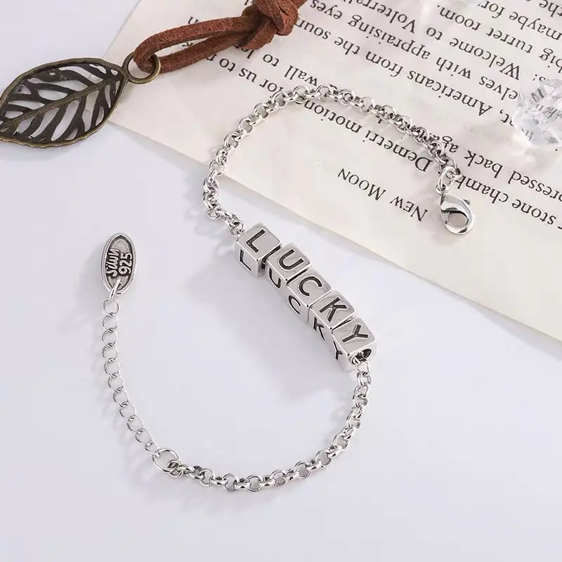 This 925 Sterling Silver Lucky Charm Bracelet features geometric cubes adorned with English letters, making it a stylish accessory for everyday and party wear.
