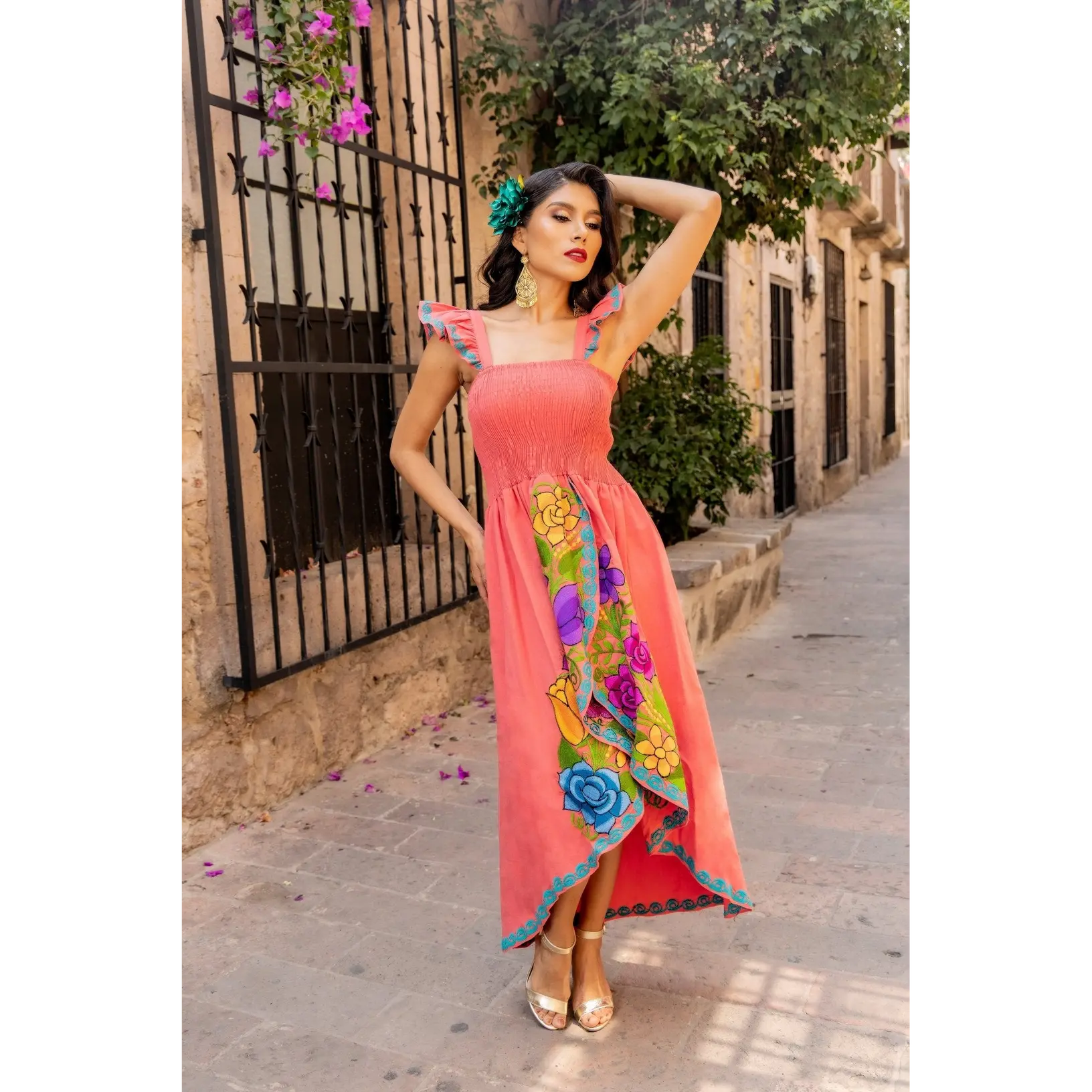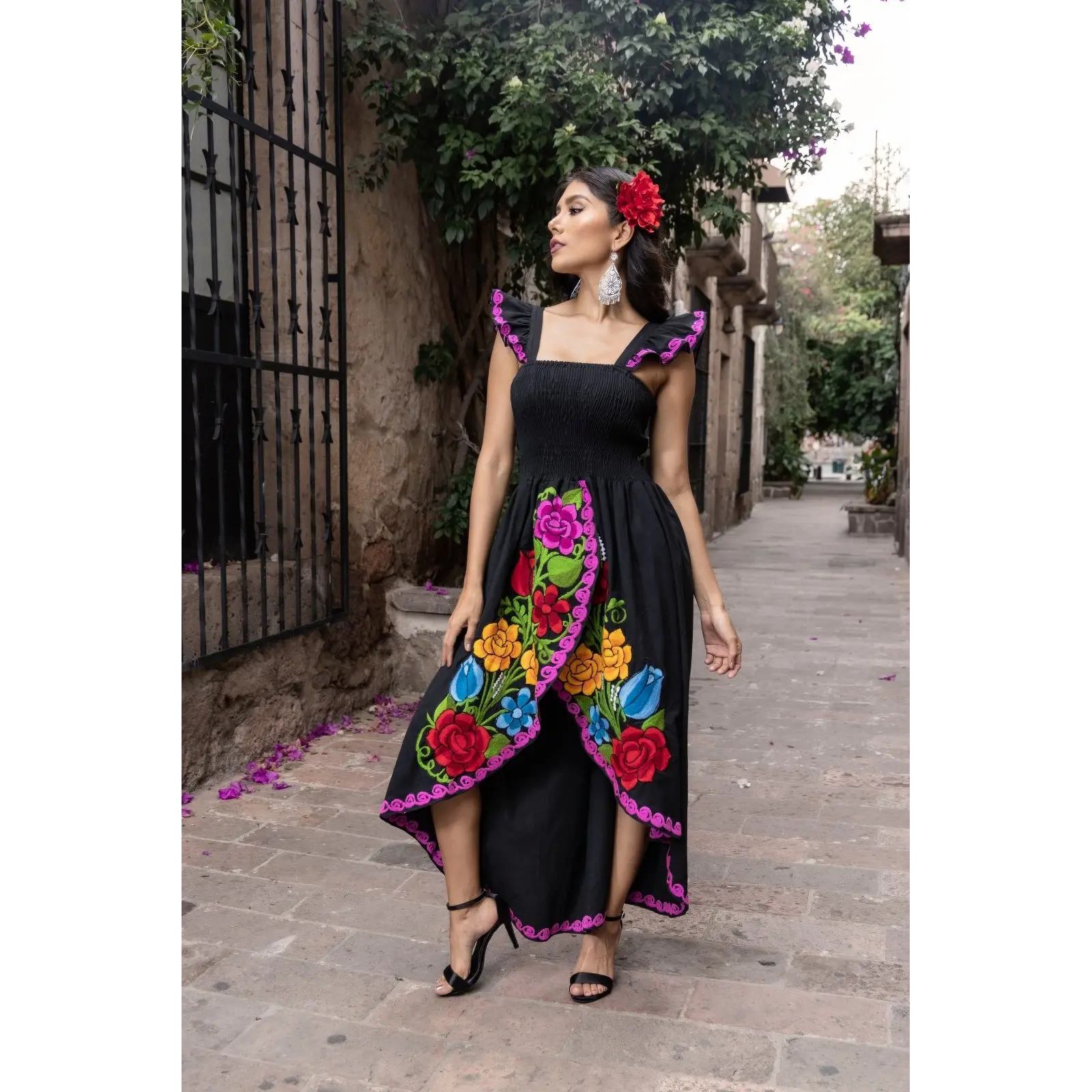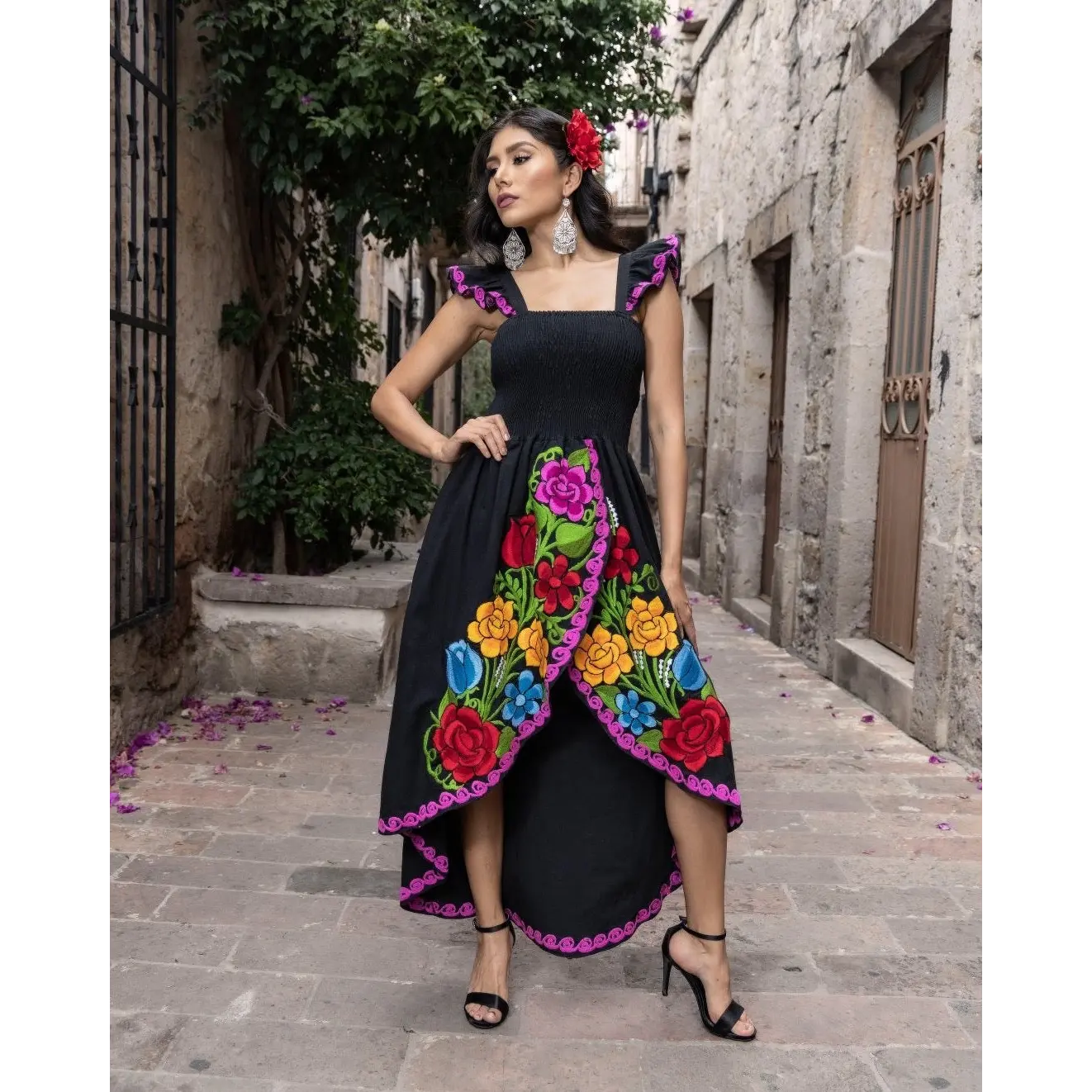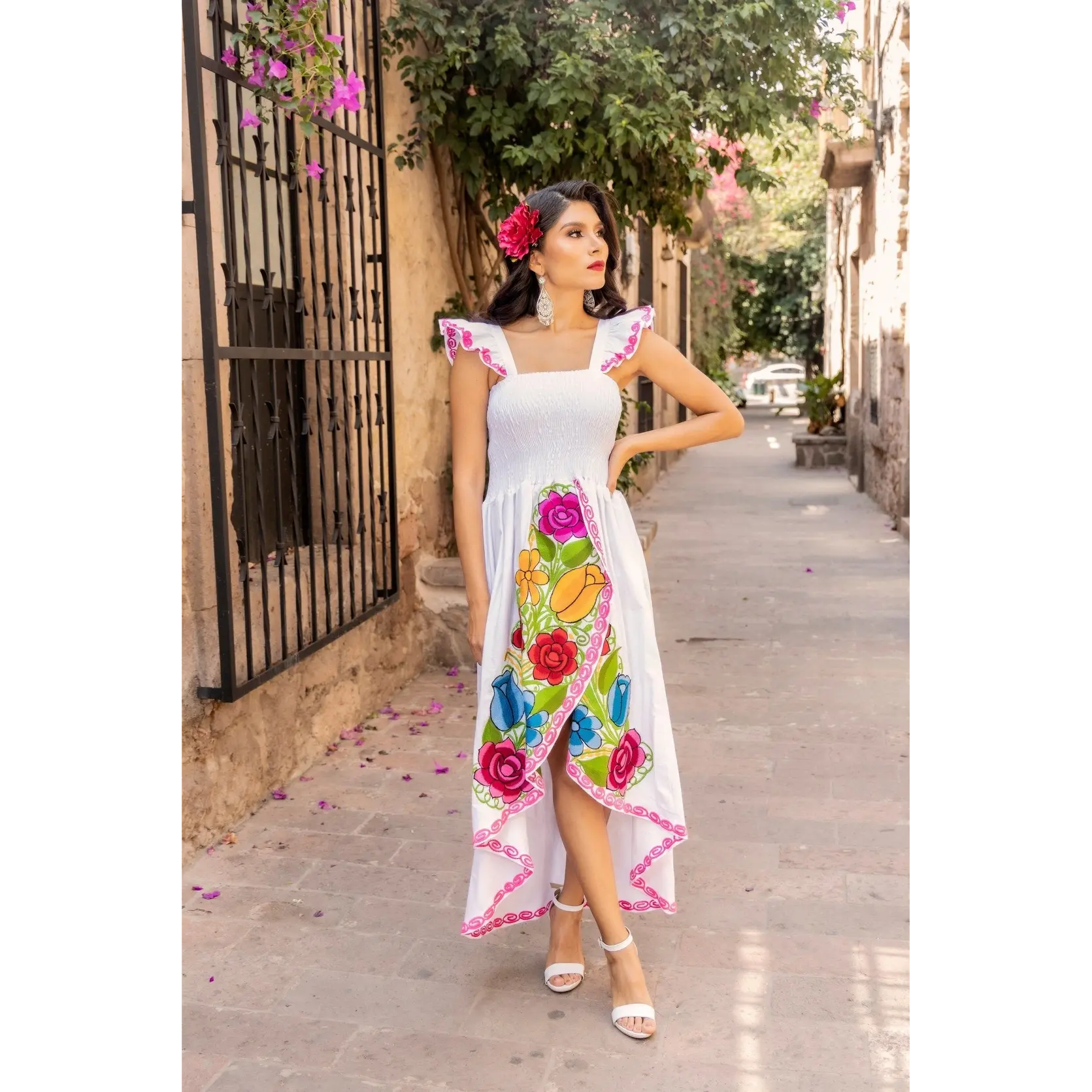 This Beautiful Dress boasts a Traditional Mexican floral design combined with a modern style dress. The embroidered floral design combined with the ruffle sleeves and slit down the leg makes it fun and flirty. It’s made out of fine Mexican cotton and elastic around the top for a tighter fit. This dress is handmade and embroidered on Artisanal Machine by Mexican Artisans in Guanajuato, Mexico.
