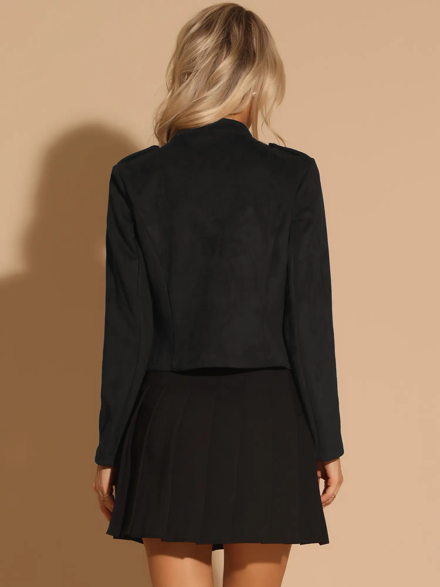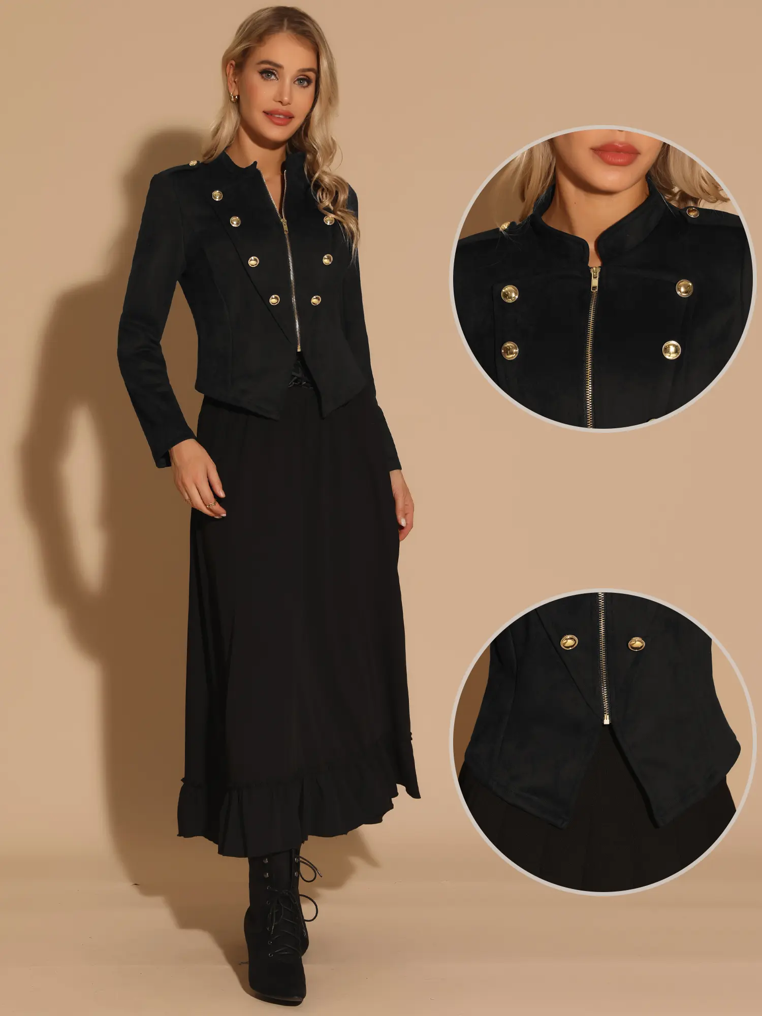 Simple and delicate, this jacket features double-breasted button decor, zipper up front design, solid black color, and a stand collar.