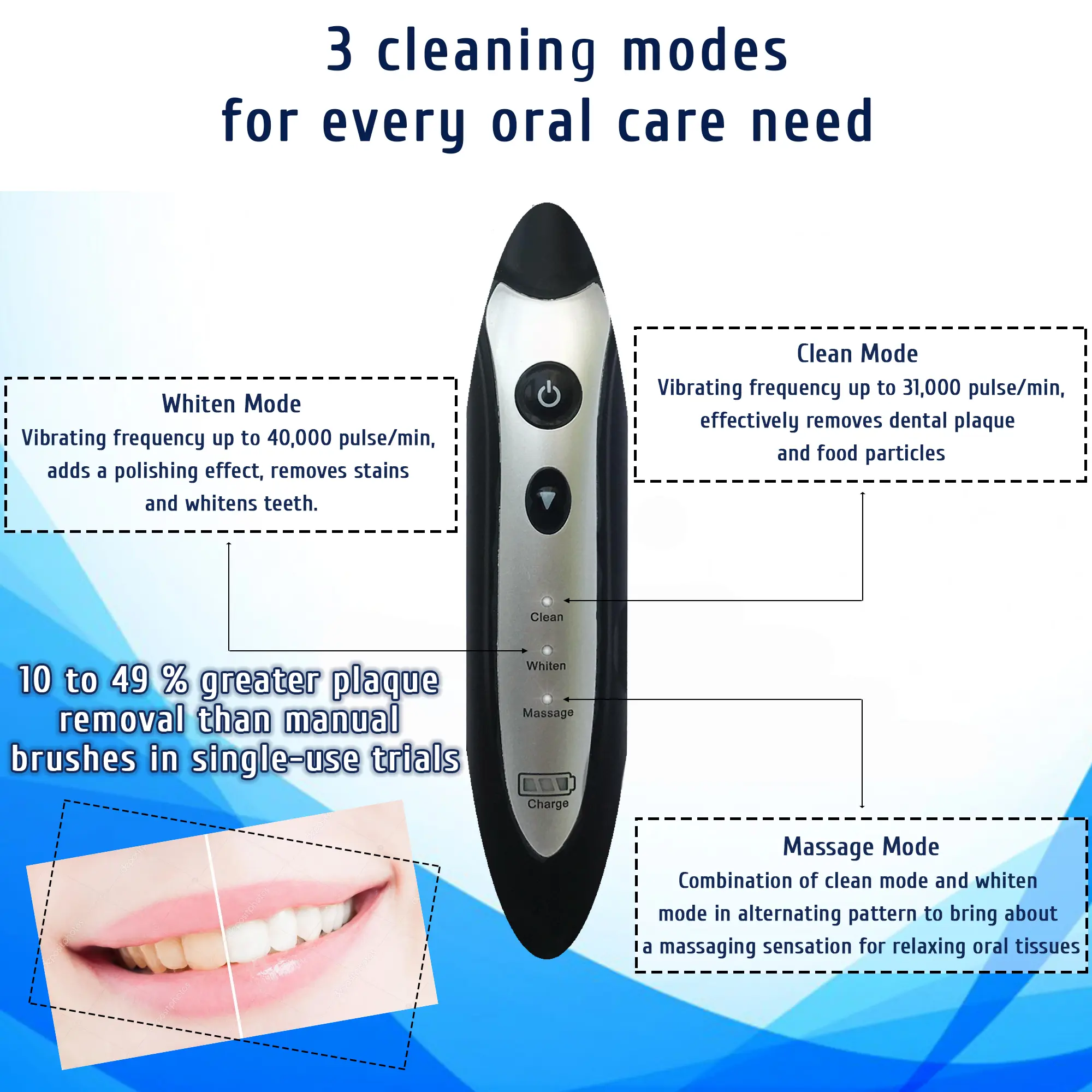 ·THREE CLEANING MODES FOR COMPREHENSIVE CLEANING: This toothbrush quickly adapts to the different types of cleaning requirements with its three distinct cleaning modes; Clean, Whiten, and Massage. This battery powered toothbrush deep cleans your teeth and gums and removes all kinds of stains and plaque. Get a shining smile and raise your confidence.