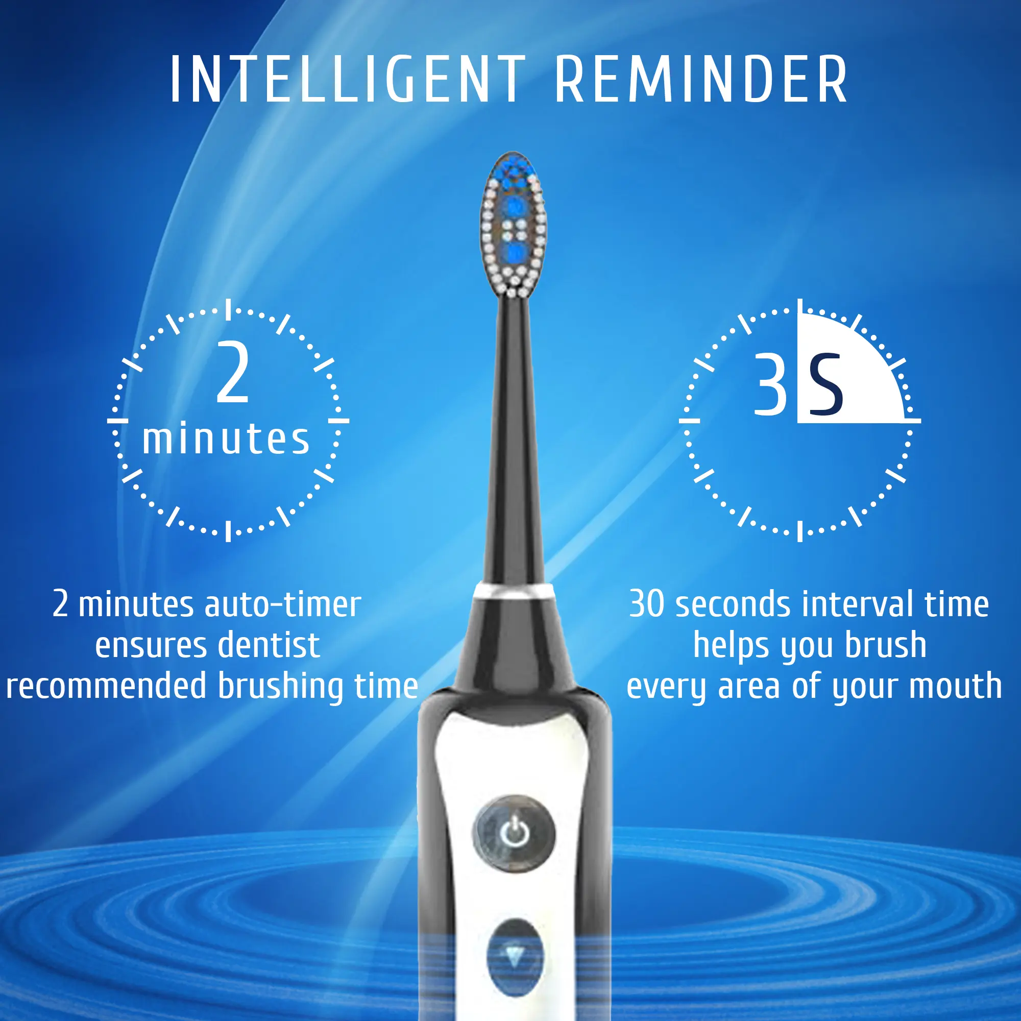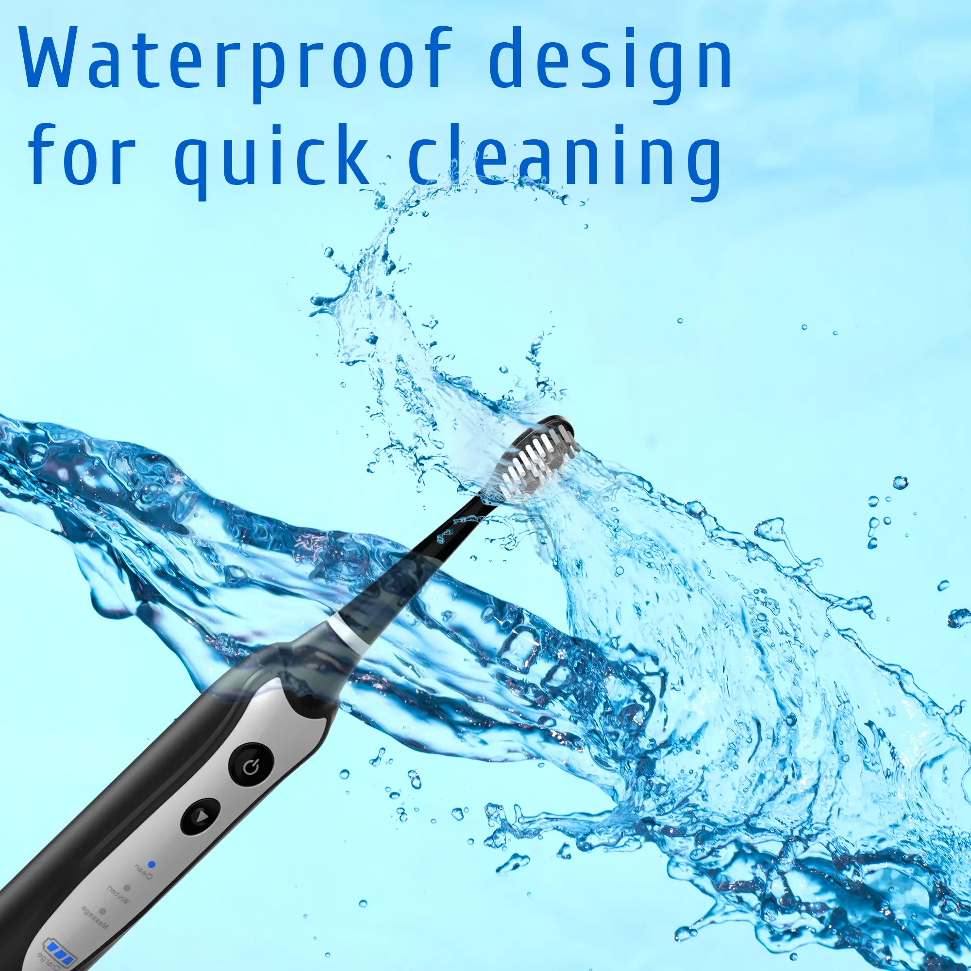 ·INTELLIGENT REMINDER, WATERPROOF TECHNOLOGY: Smart 30-second reminder. This electric toothbrush automatically halts briefly after every 30 seconds to help you change quadrants and adjust the brushing direction. The waterproof technology in this portable toothbrush soft ensures protection against water splashes and enables you to use them more freely under wet conditions. Waterproof, Battery toothbrush for adults with an ergonomic and no-slip handle.