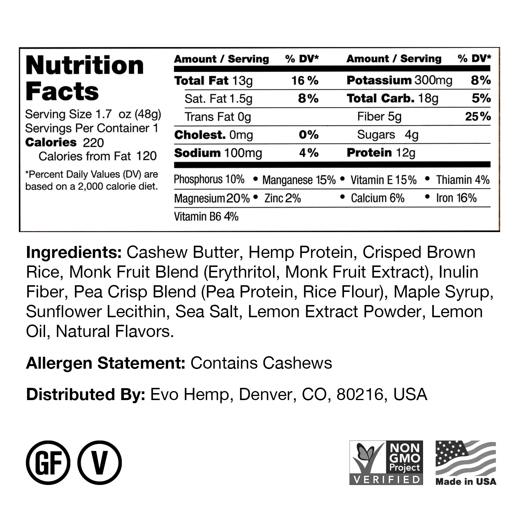 Cashew Butter,Hemp Protein,Crisped Brown Rice,Monk Fruit Blend (Erythritol,Monk Fruit Extract),Inulin Fiber,Pea Crisp Blend (Pea Protein,Rice Flour),Maple Syrup,Sunflower Lecithin,Sea Salt,Lemon Extract Powder,Lemon Oil,Natural Flavors