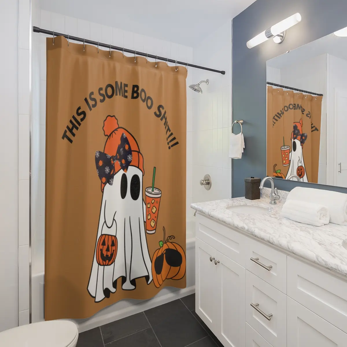 This shower curtain is here to add an original touch to any bathroom with your designs. Made with highly durable polyester, this curtain stays like new for a long time to come and is a perfect printing area for your art. Please note: While polyester offers adequate protection against water, a liner might be necessary for full waterproofness.