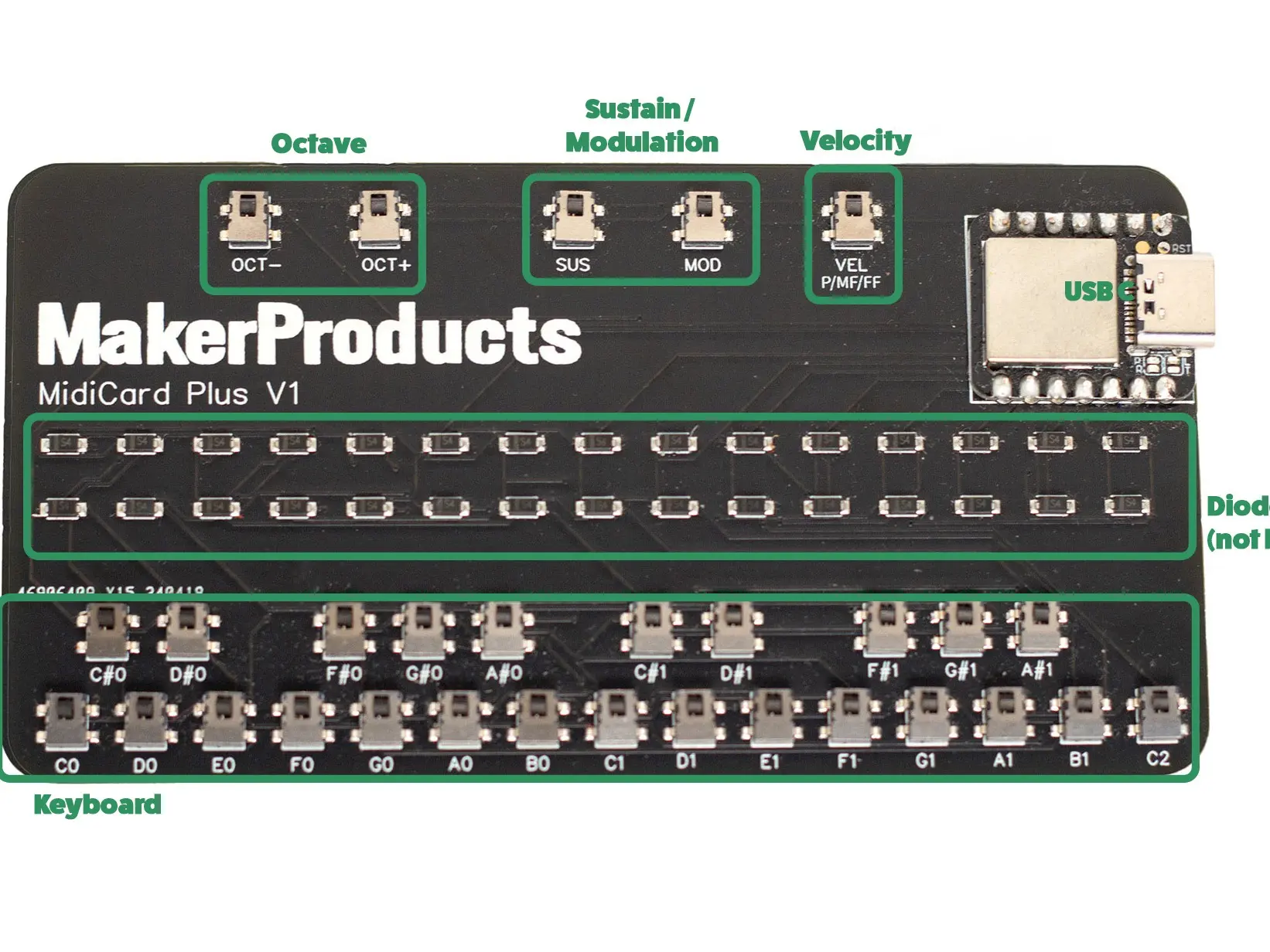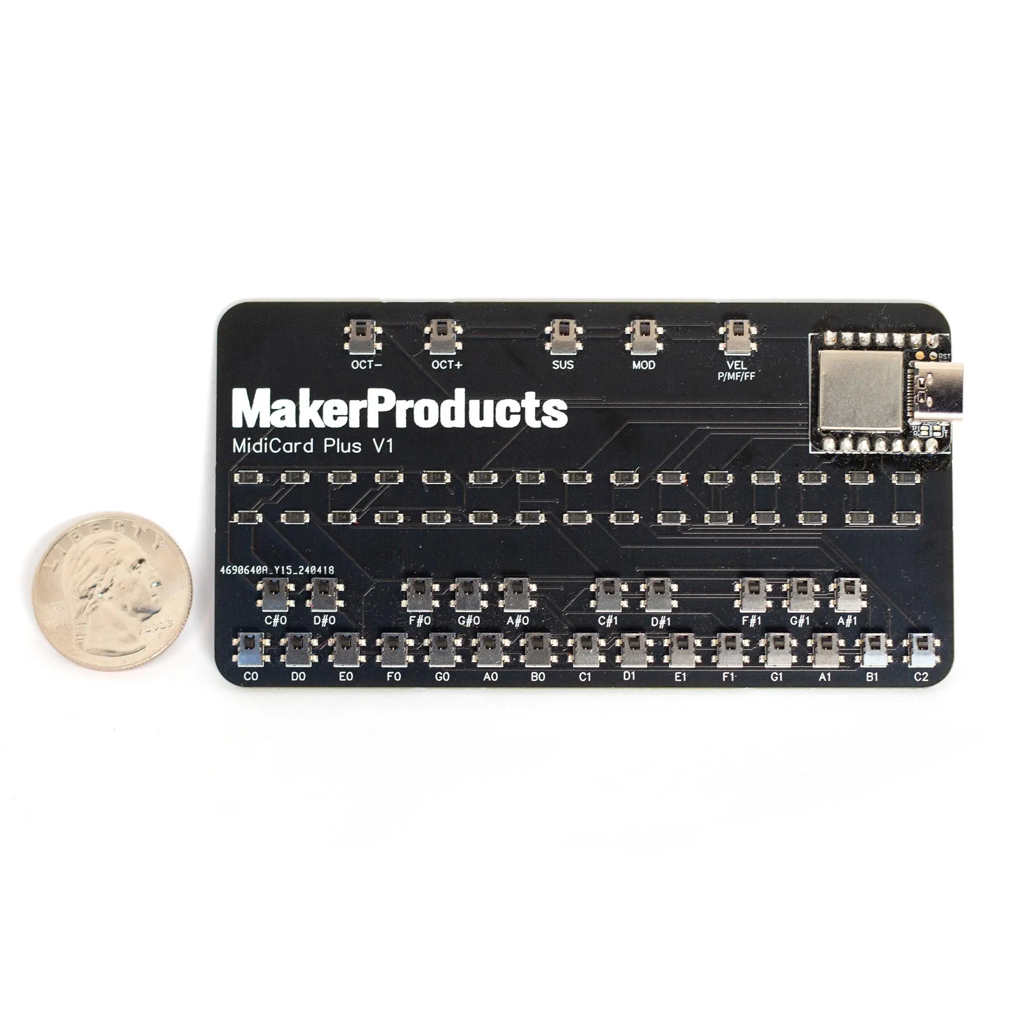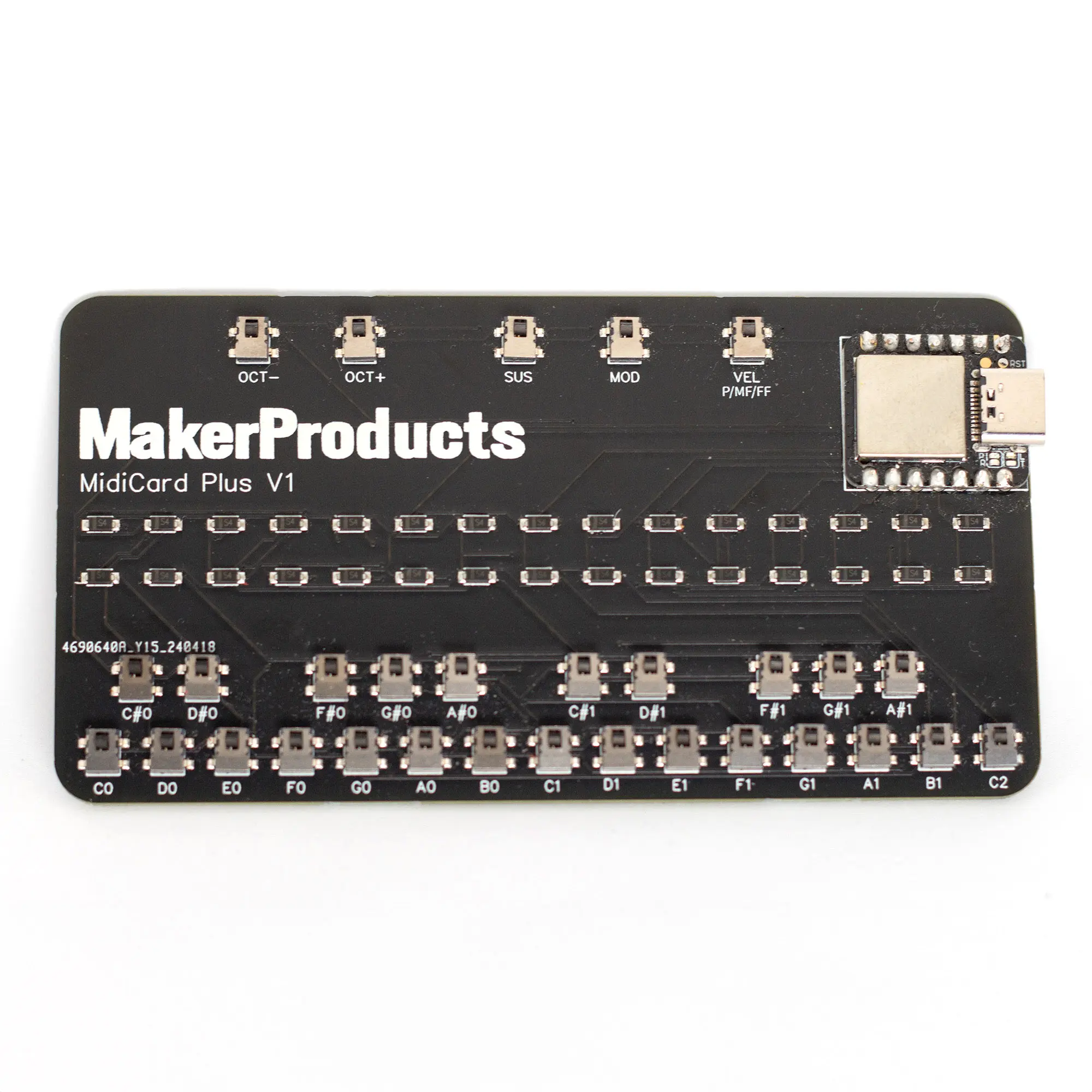 MidiCard Plus comes bundled with a short USB-C cable, and moderate caution should be taken to avoid static electricity and water. It is made with Lead Free HASL, Lead Free Solder, and RoHS components.