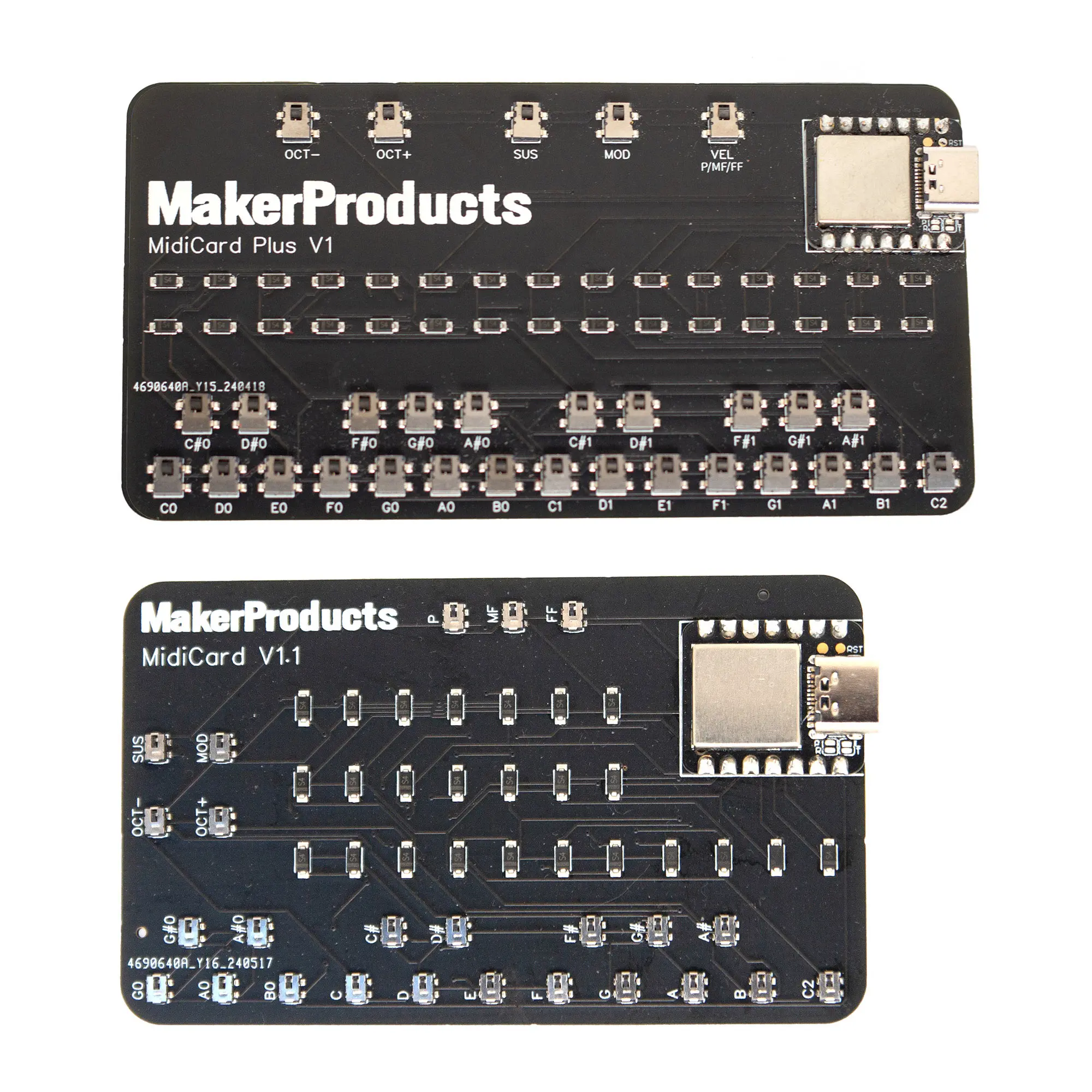 By switching the P/MF/FF buttons to a one-button toggle, the Plus uses the same processor as the MidiCard but can handle 25 keys. The MidiCard Plus uses larger, more sturdy buttons than the MidiCard - they still have click-less spring action, but are more durable and take slightly more effort to press than the original MidiCard's buttons.