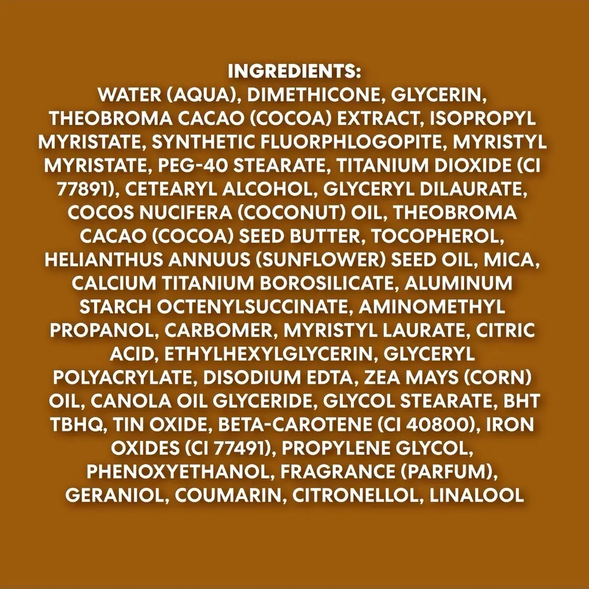| Ingredients | INGREDIENTS: Water (Aqua), Dimethicone, Glycerin, Theobroma Cacao (Cocoa Extract, Isopropyl Myristate, Synthetic Fluorphlogopite, Myristyl Myristate, PEG-40 Stearate, Titanium Dioxide (Cl 7789)), Cetearyl Alcohol, VEGAN FRIENDLY Glyceryl Dilaurate, Cocos Nucifera (Coconut) Oil, Theobroma Cacao (Cocoa) Seed Butter, Tocopherol, Helianthus Annuus (Sunflower) Seed Oil, Mica, Calcium Titanium Borosilicate, Aluminum Starch Octenylsuccinate, Aminomethyl Propanol, Carbomer, Myristyl Laurate, Citric Acid, Ethylhexy/glycerin, Glyceryl Polyacrylate, Disodium EDTA, Zea Mays (Corn) Oil, Canola Oil Glyceride, Glycol Stearate, BHT, Tohq, Tin Oxide, Beta-Carotene (CI 40800), Iron Oxides (Cl 77491), Propylene Glycol, Phenoxyethandl, Frogrance (Parfum). Geraniol, Coumarin, Citronellol, Linalool. |
