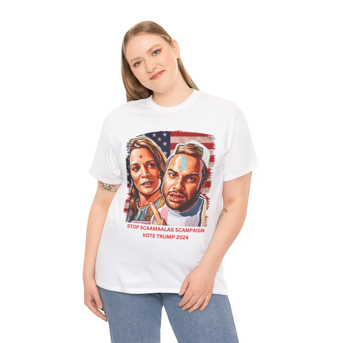 Express your political opinions with this conservative-themed T-Shirt featuring the iconic 'SCAMALA HARRIS' phrase from Tiktok comedian Brandomino_Effect. Perfect for showing support for Trump during elections. Ideal for conservative individuals looking to make a statement. Relevant for political events, rallies, and casual wear.