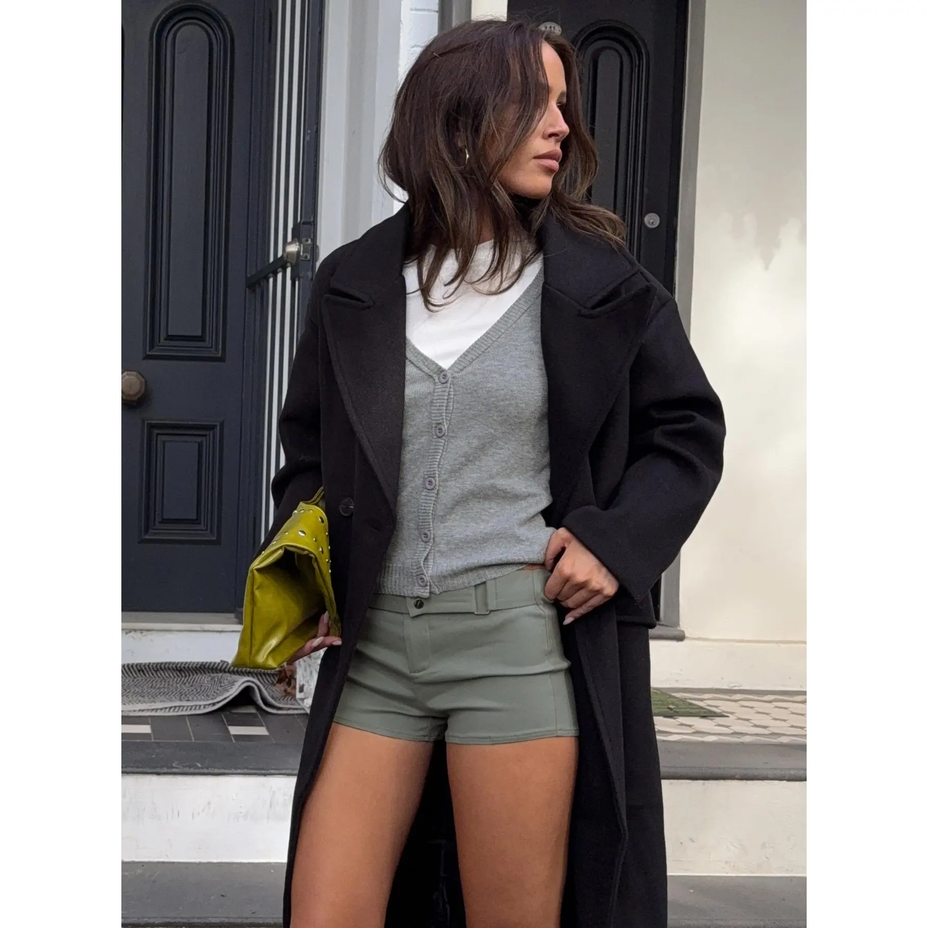 ·V-neckline, button-up closure, drop shoulders
