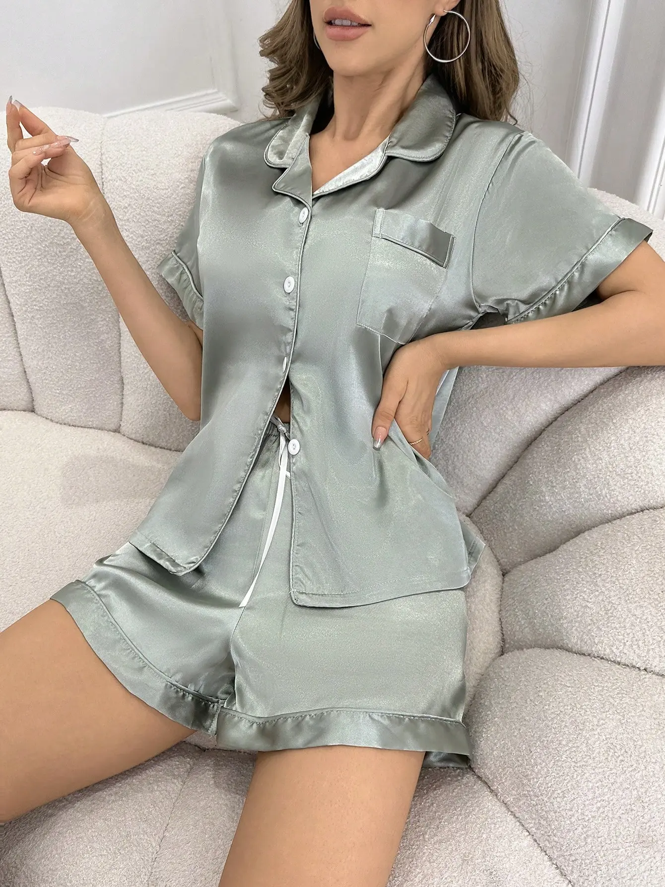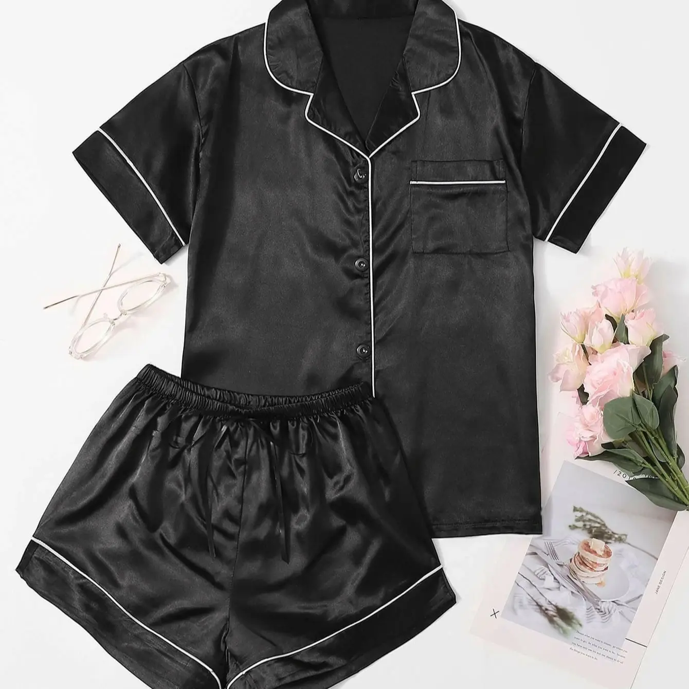 This Pocket Front Satin Short Sleeve Shirt and Shorts Pajamas Set combines comfort and style, perfect for lounging at home or casual family moments. Here are the details: