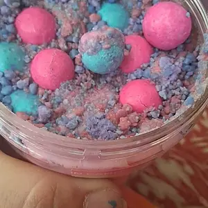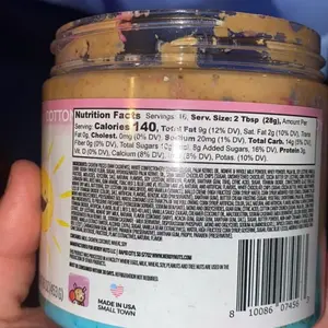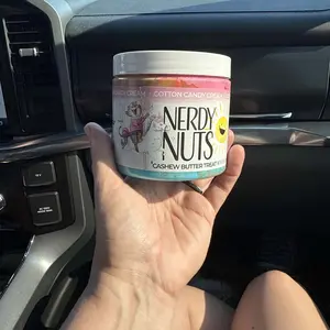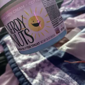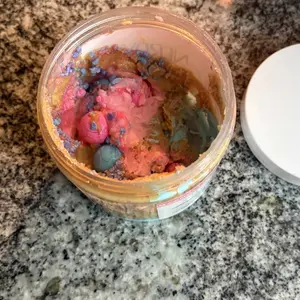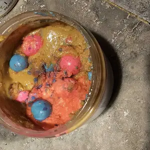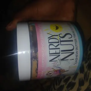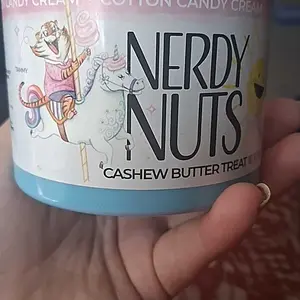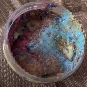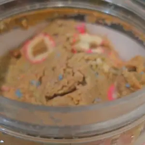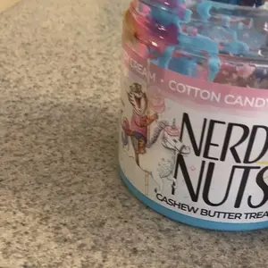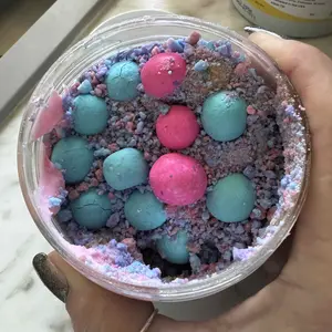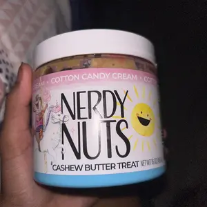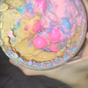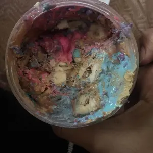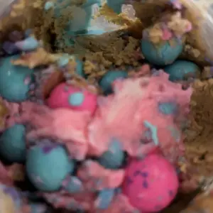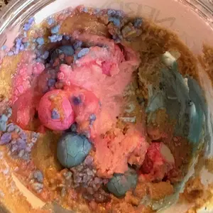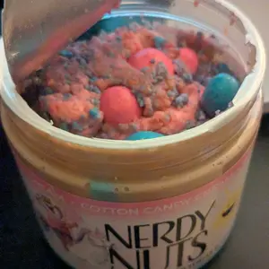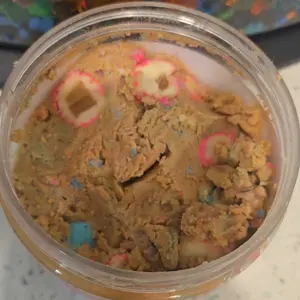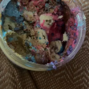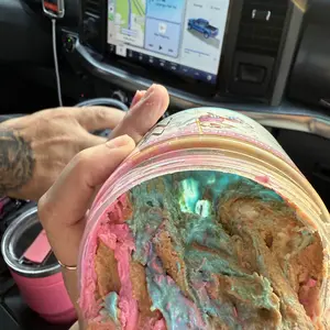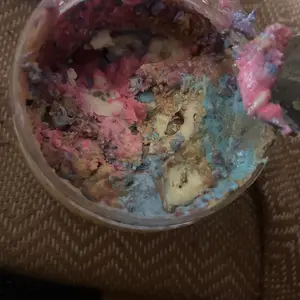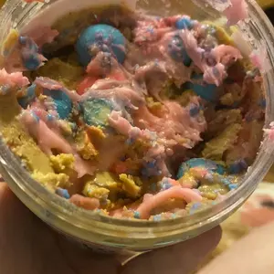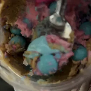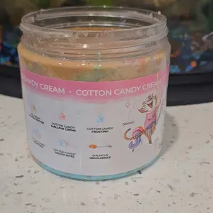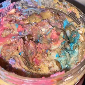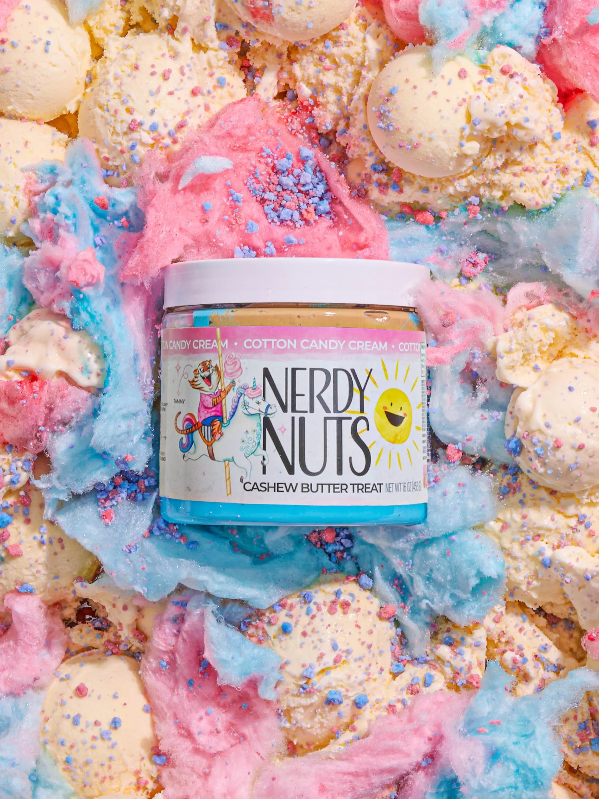 Vanilla ice cream cashew butter is layered on blue cotton candy mallow creme, swirled with pink cotton candy frosting, topped with cotton candy dough bites & cotton candy crunchies!
