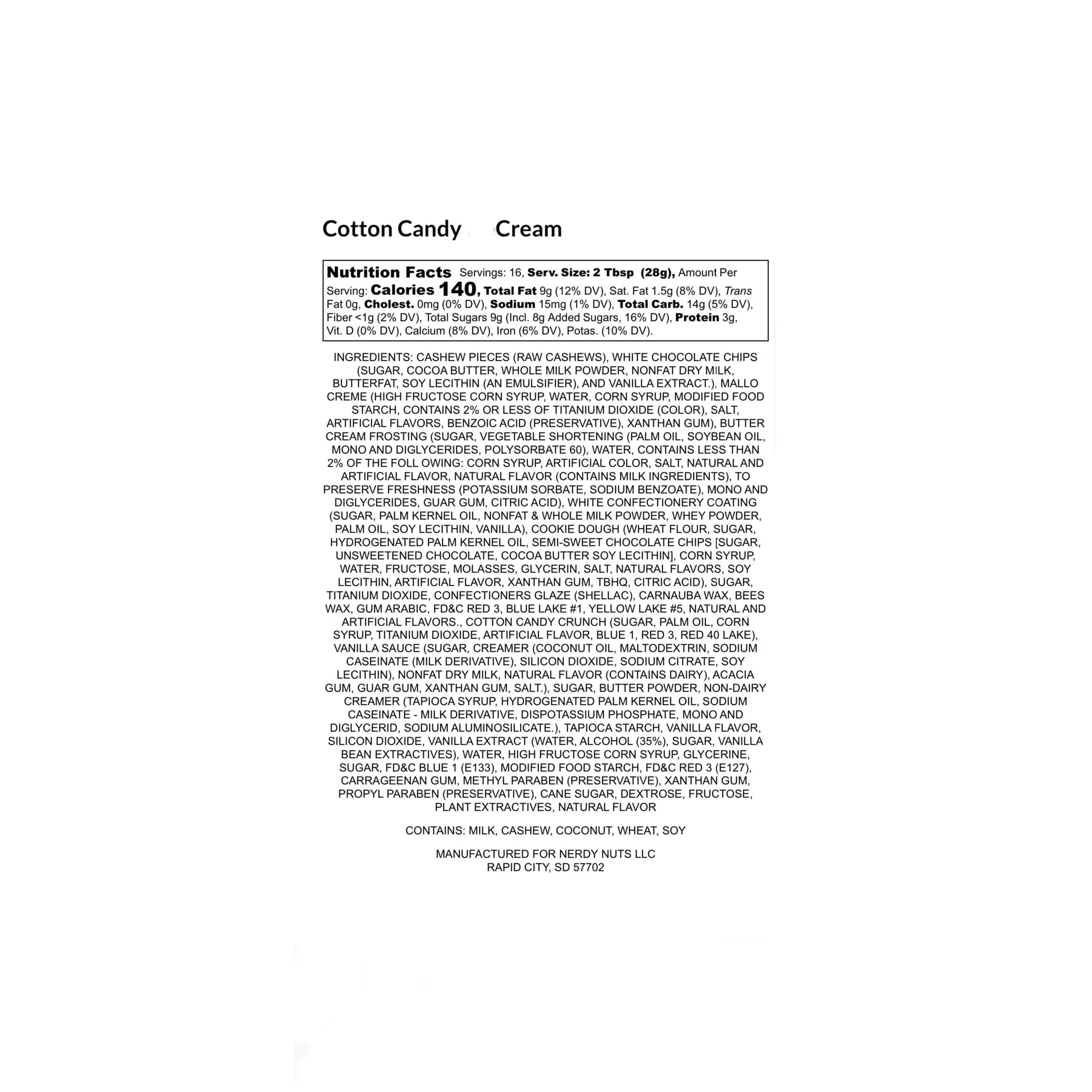 INGREDIENTS: CASHEW PIECES (RAW CASHEWS), WHITE CHOCOLATE CHIPS (SUGAR, COCOA BUTTER, WHOLE MILK POWDER, NONFAT DRY MILK, BUTTERFAT, SOY LECITHIN (AN EMULSIFIER), AND VANILLA EXTRACT.), MALLO CREME (HIGH FRUCTOSE CORN SYRUP, WATER, CORN SYRUP, MODIFIED FOOD STARCH, CONTAINS 2% OR LESS OF TITANIUM DIOXIDE (COLOR), SALT, ARTIFICIAL FLAVORS, BENZOIC ACID (PRESERVATIVE), XANTHAN GUM), BUTTER CREAM FROSTING (SUGAR, VEGETABLE SHORTENING (PALM OIL, SOYBEAN OIL, MONO AND DIGLYCERIDES, POLYSORBATE 60), WATER, CONTAINS LESS THAN 2% OF THE FOLL OWING: CORN SYRUP, ARTIFICIAL COLOR, SALT, NATURAL AND ARTIFICIAL FLAVOR, NATURAL FLAVOR (CONTAINS MILK INGREDIENTS), TO PRESERVE FRESHNESS (POTASSIUM SORBATE, SODIUM BENZOATE), MONO AND DIGLYCERIDES, GUAR GUM, CITRIC ACID), WHITE CONFECTIONERY COATING (SUGAR, PALM KERNEL OIL, NONFAT & WHOLE MILK POWDER, WHEY POWDER, PALM OIL, SOY LECITHIN, VANILLA), COOKIE DOUGH (WHEAT FLOUR, SUGAR, HYDROGENATED PALM KERNEL OIL, SEMI-SWEET CHOCOLATE CHIPS [SUGAR, UNSWEETENED CHOCOLATE, COCOA BUTTER SOY LECITHIN], CORN SYRUP, WATER, FRUCTOSE, MOLASSES, GLYCERIN, SALT, NATURAL FLAVORS, SOY LECITHIN, ARTIFICIAL FLAVOR, XANTHAN GUM, TBHQ, CITRIC ACID), SUGAR, TITANIUM DIOXIDE, CONFECTIONERS GLAZE (SHELLAC), CARNAUBA WAX, BEES WAX, GUM ARABIC, FD&C RED 3, BLUE LAKE #1, YELLOW LAKE #5, NATURAL AND ARTIFICIAL FLAVORS., COTTON CANDY CRUNCH (SUGAR, PALM OIL, CORN SYRUP, TITANIUM DIOXIDE, ARTIFICIAL FLAVOR, BLUE 1, RED 3, RED 40 LAKE), VANILLA SAUCE (SUGAR, CREAMER (COCONUT OIL, MALTODEXTRIN, SODIUM CASEINATE (MILK DERIVATIVE), SILICON DIOXIDE, SODIUM CITRATE, SOY LECITHIN), NONFAT DRY MILK, NATURAL FLAVOR (CONTAINS DAIRY), ACACIA GUM, GUAR GUM, XANTHAN GUM, SALT.), SUGAR, BUTTER POWDER, NON-DAIRY CREAMER (TAPIOCA SYRUP, HYDROGENATED PALM KERNEL OIL, SODIUM CASEINATE - MILK DERIVATIVE, DISPOTASSIUM PHOSPHATE, MONO AND DIGLYCERID, SODIUM ALUMINOSILICATE.), TAPIOCA STARCH, VANILLA FLAVOR, SILICON DIOXIDE, VANILLA EXTRACT (WATER, ALCOHOL (35%), SUGAR, VANILLA BEAN EXTRACTIVES), WATER, HIGH FRUCTOSE CORN SYRUP, GLYCERINE, SUGAR, FD&C BLUE 1 (E133), MODIFIED FOOD STARCH, FD&C RED 3 (E127), CARRAGEENAN GUM, METHYL PARABEN (PRESERVATIVE), XANTHAN GUM, PROPYL PARABEN (PRESERVATIVE), CANE SUGAR, DEXTROSE, FRUCTOSE, PLANT EXTRACTIVES, NATURAL FLAVOR