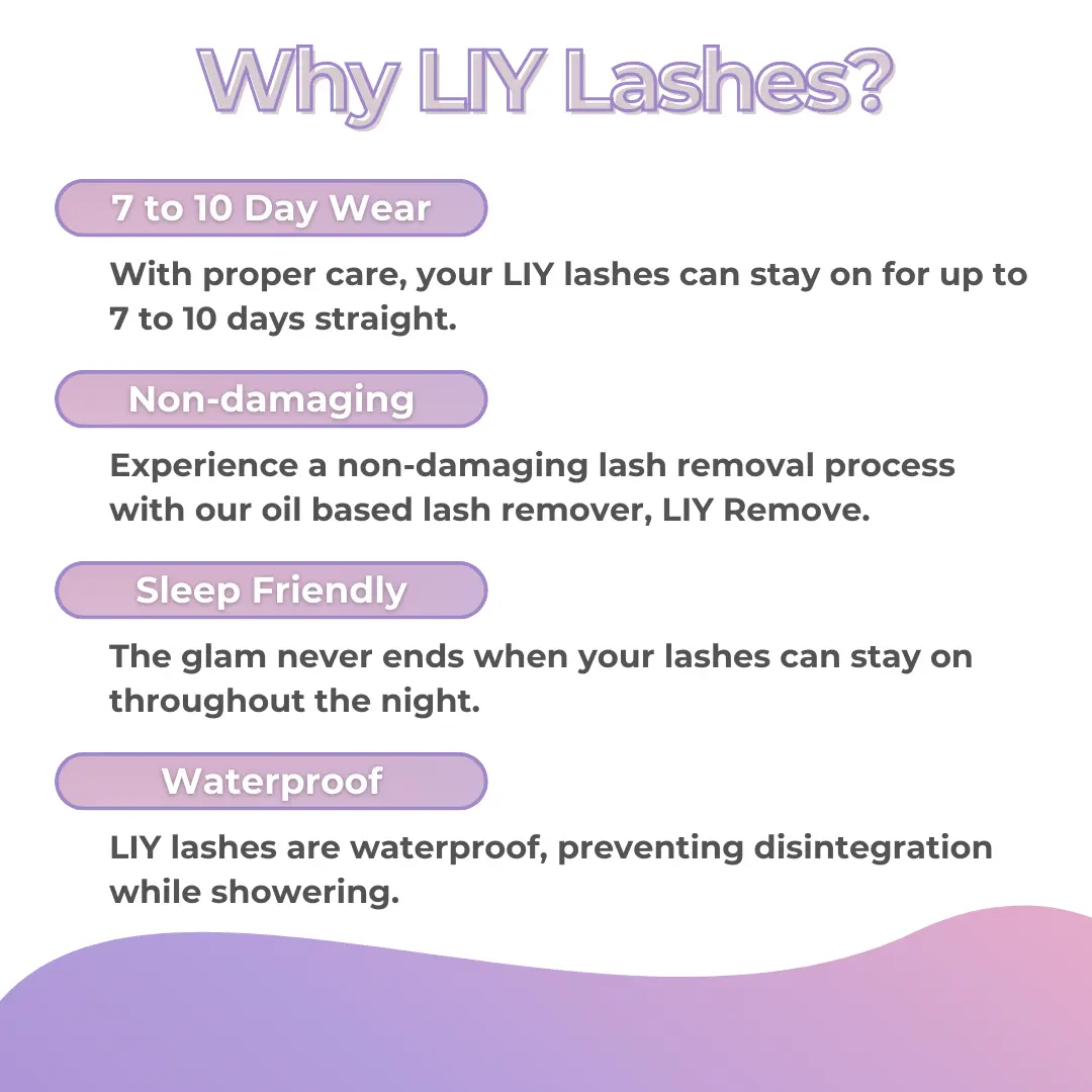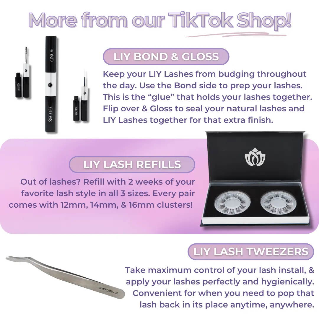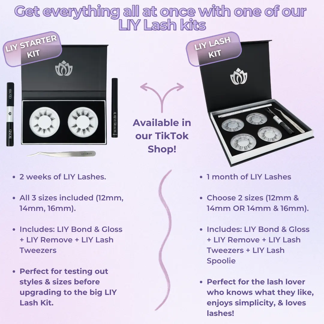 ·LIY Starter Kits: 2 weeks worth of LIY Lashes/ All 3 lash sizes included (12mm, 14mm, 16mm), LIY Bond & Gloss, LIY Remove, LIY Lash Tweezers.