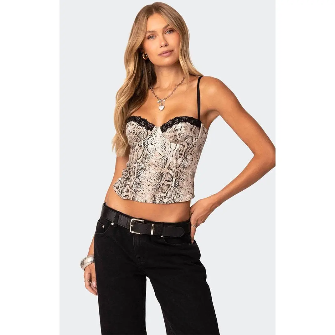 Online only! This is the cool girl Snakeskin Denim Corset from Edikted you need to throw on with jeans or dress up for a night out. With its amazing snakeskin printed fabric and lace up back closure, it will have you looking snatched wherever you go.
