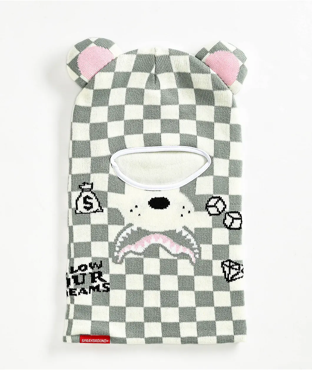Make a statement with the Sprayground Rose Money Bear balacalva. This knit ski mask features a white and grey checkered pattern throughout and is accented with teddy bear ear details..