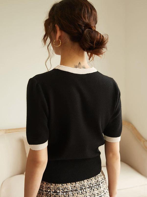 Women's French Knit Commuter Top, Colorblock Round Neck Short Sleeve Loose Fit T-Shirt, Casual Summer & Spring Fashion