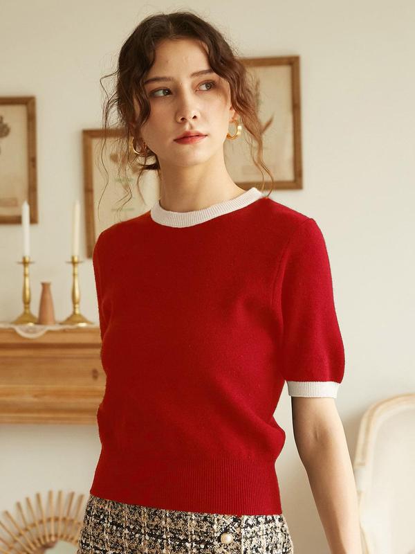 5. Women's French Knit Commuter Top, Colorblock Round Neck Short Sleeve Loose Fit T-Shirt, Casual Summer & Spring Fashion
