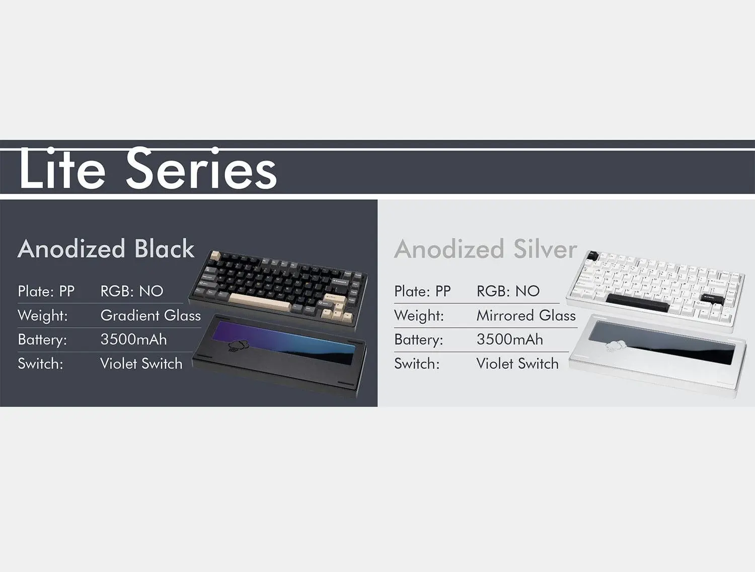 ·Fully Assembled RGB includedPCB-Gasket, CNC Frame5 Types of FoamsTri mode wireless 2.4G/BT5.0/WiredHMX Switches IncludedHigh-Quality Double Shot Keycaps IncludedPP Plate3500 mAh Battery (450 hours)VIA Support Over 2.4G/WiredAnodized ColorsGlass Weights